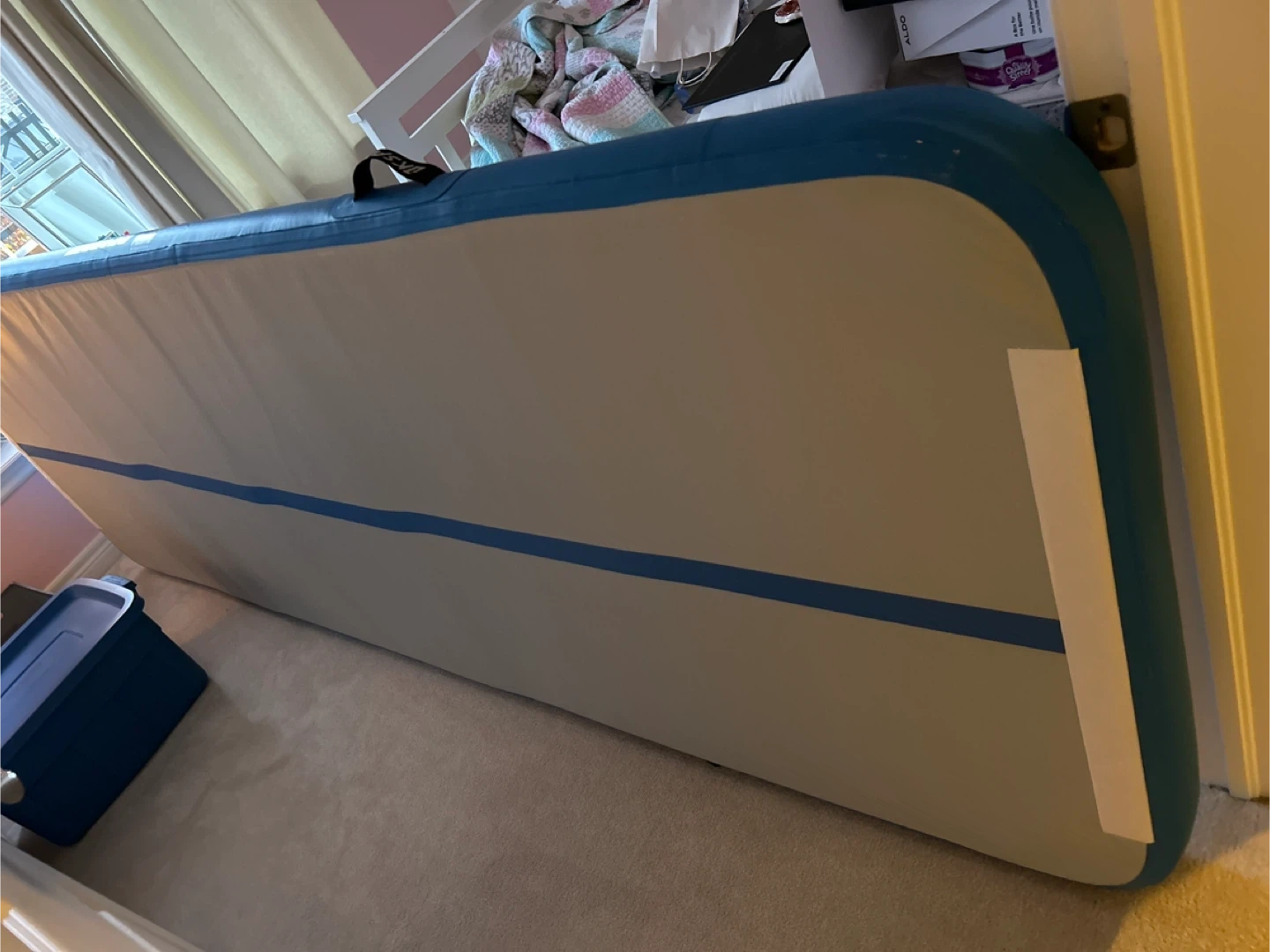 5Selling an AKSPORT tumbling mat, barely used, perfect for gymnastics or cheer practice at home! It's in great shape and ready for its next gymnast. Electric Air pump available and working but there is a little plastic piece broken off the pump.