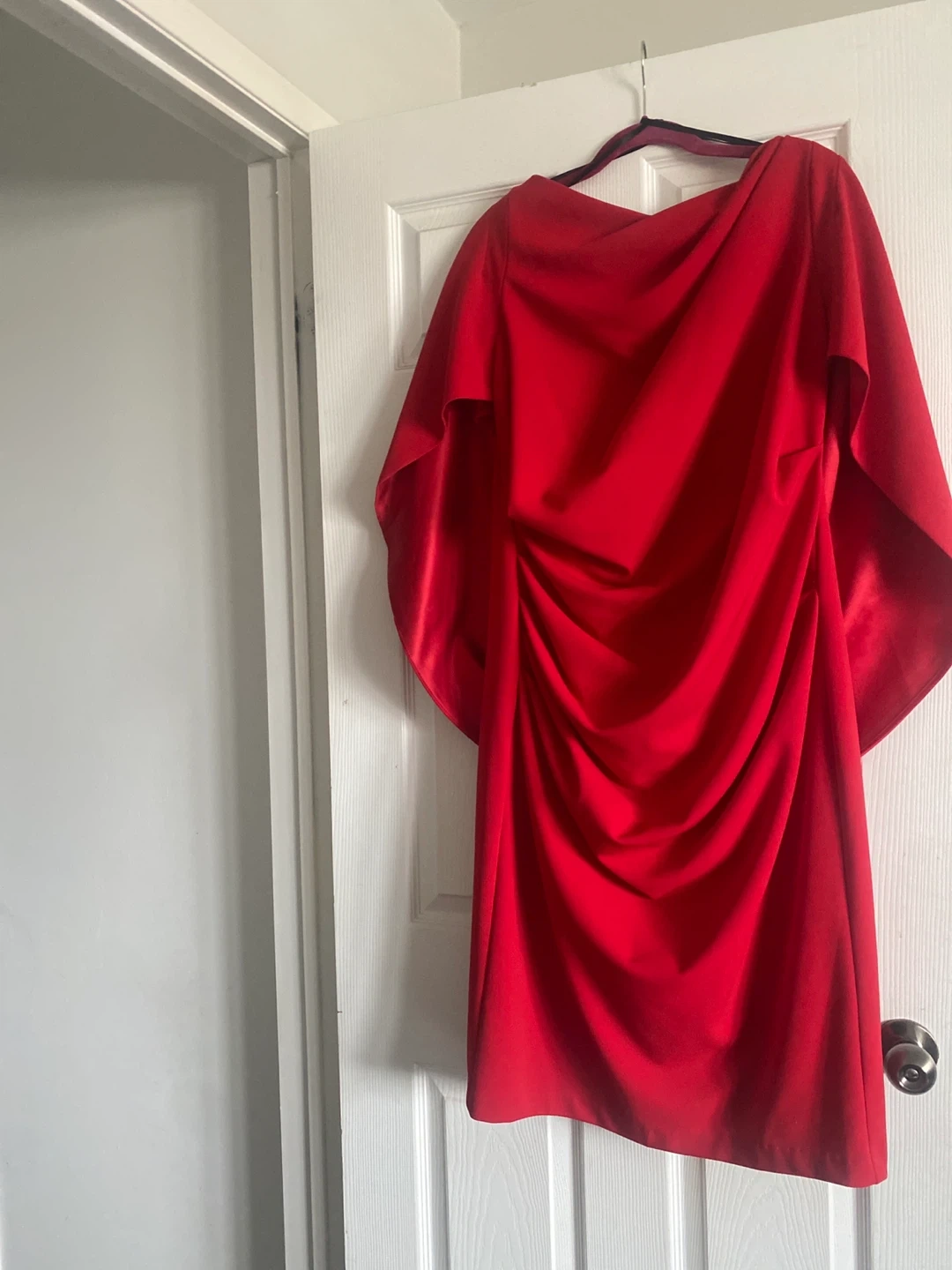 This stylish red dress features a flattering ruched front and elegant cape. It's made from a smooth, comfortable fabric perfect for various occasions. The knee-length design with a ruched adds a touch of sophistication. Great for a night out or a special event! Size 14