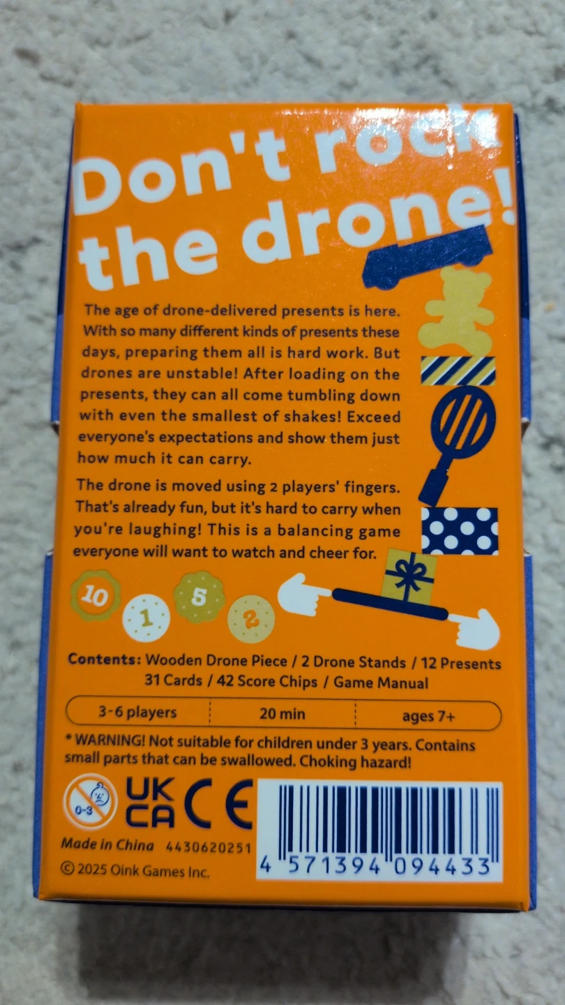 This is the "Don't Rock the Drone!" balancing game. It's for 3-6 players and takes about 20 minutes to play. The set includes 2 Drone Stands, 12 Presents, 31 Wooden Drone Pieces, and 42 Score Chips.