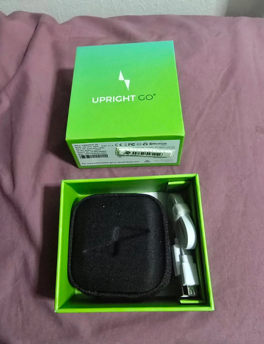 This is the Upright GO S Lite posture trainer. It's a device designed to help improve your posture. Includes the device, charging cable, and carrying case.