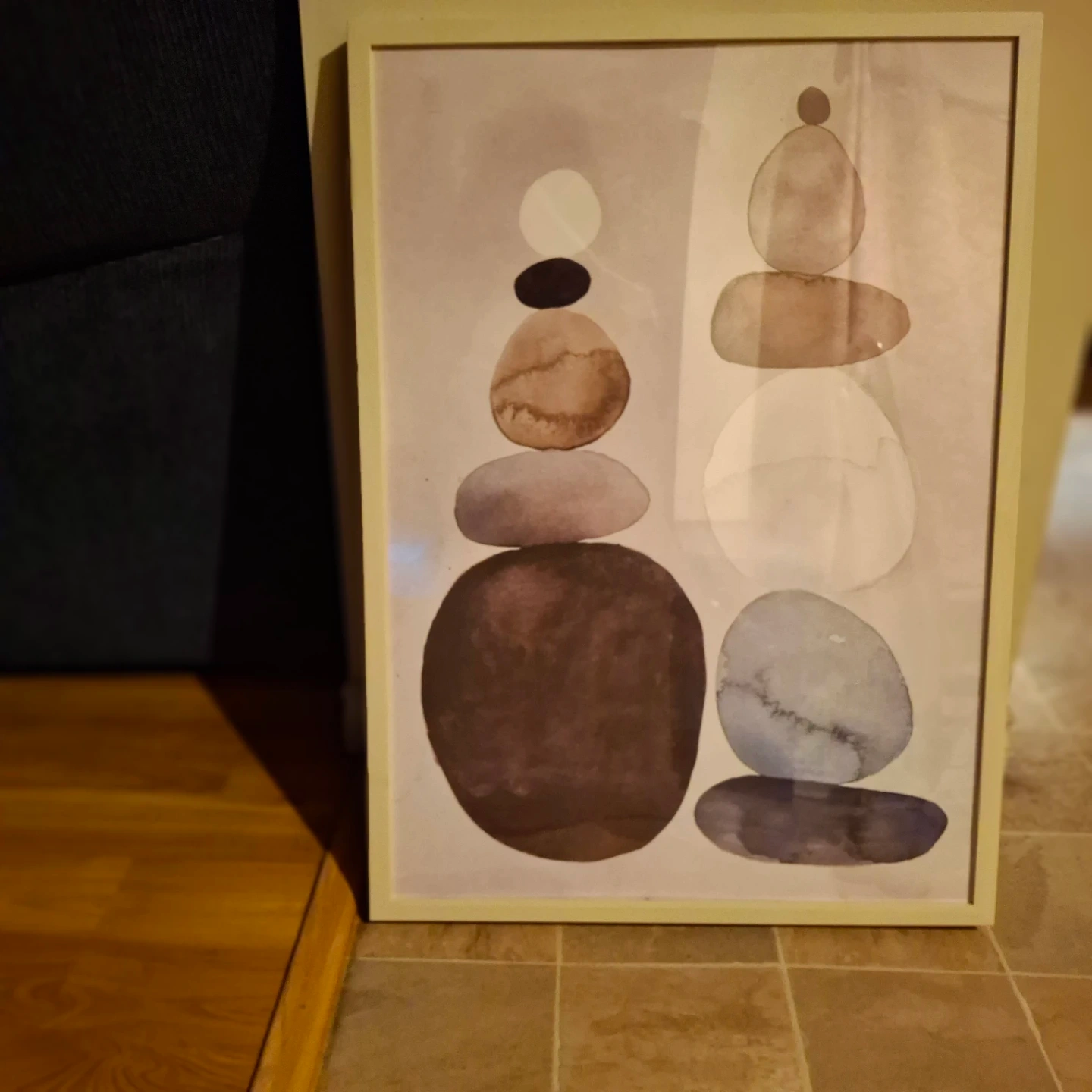 This framed art print features a soothing abstract design with stacked watercolour stones in earthy tones. It's a lovely piece to add a touch of calm to any room. The art is framed in a light wood-look border.