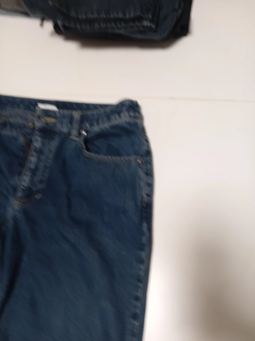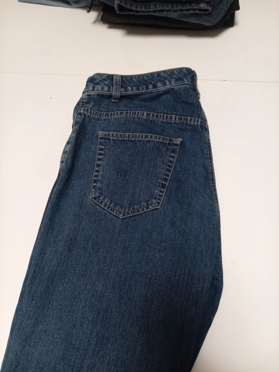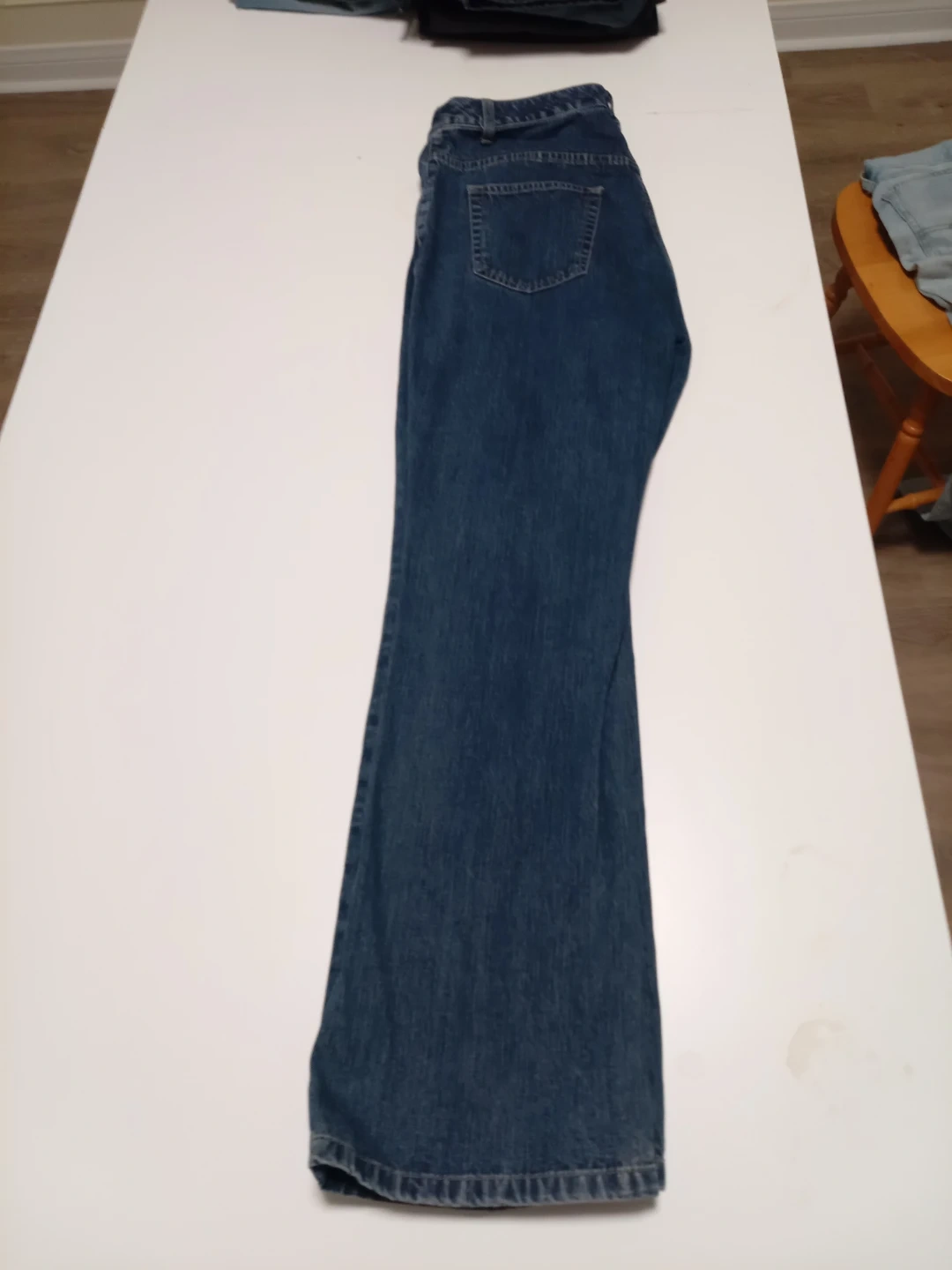 Classic blue denim jeans with a bootcut style. These pants are made from durable denim fabric. They feature a mid-rise waist and a zip fly with button closure.