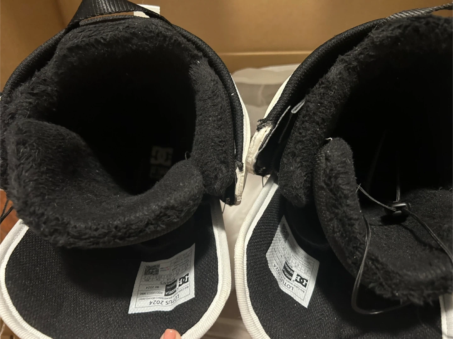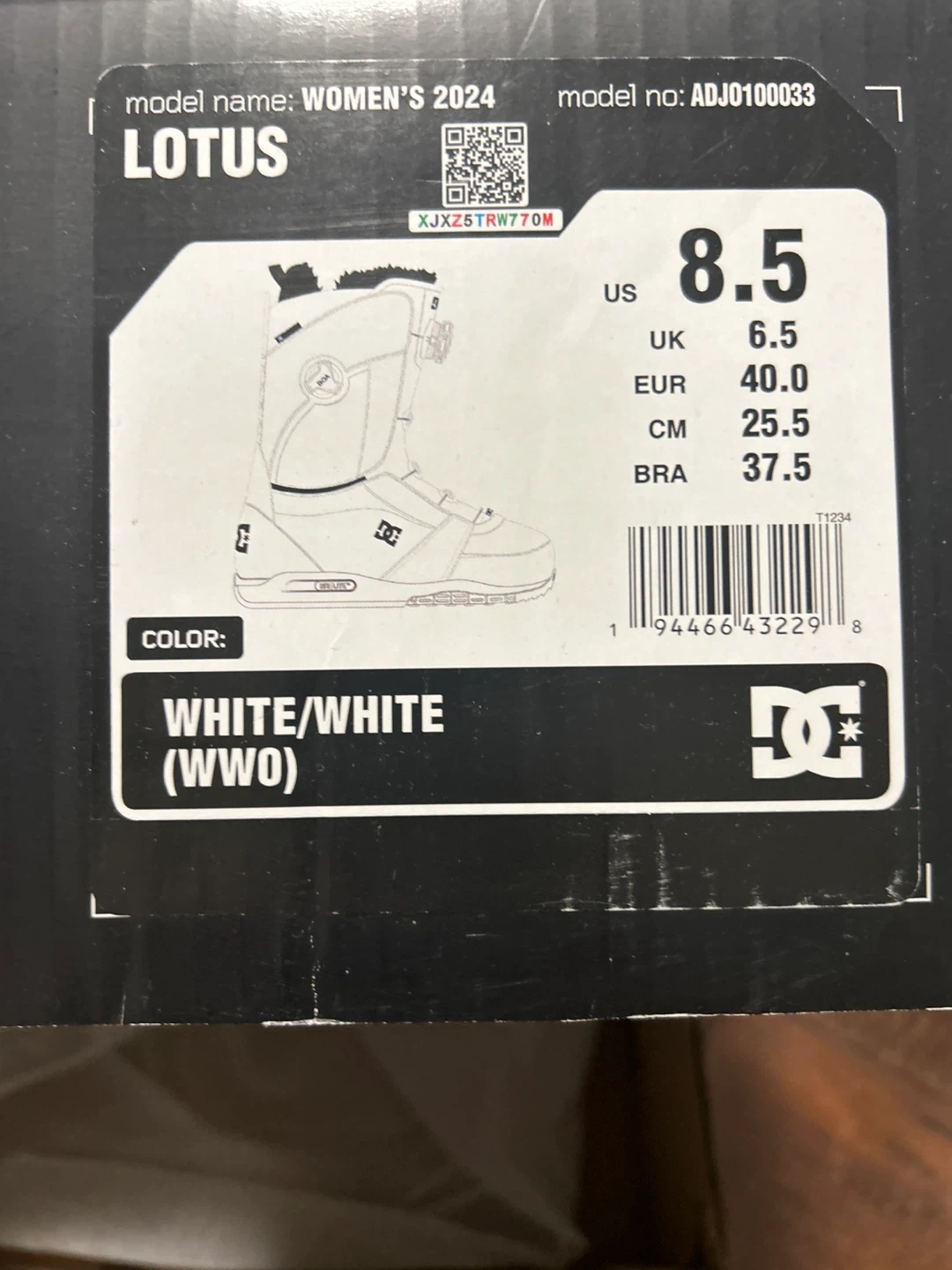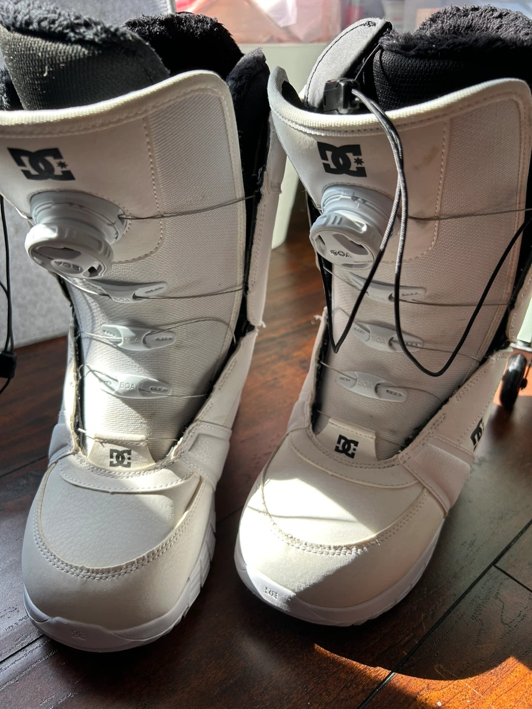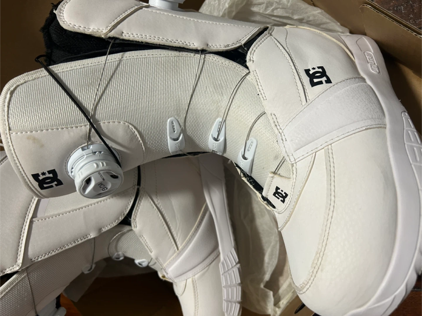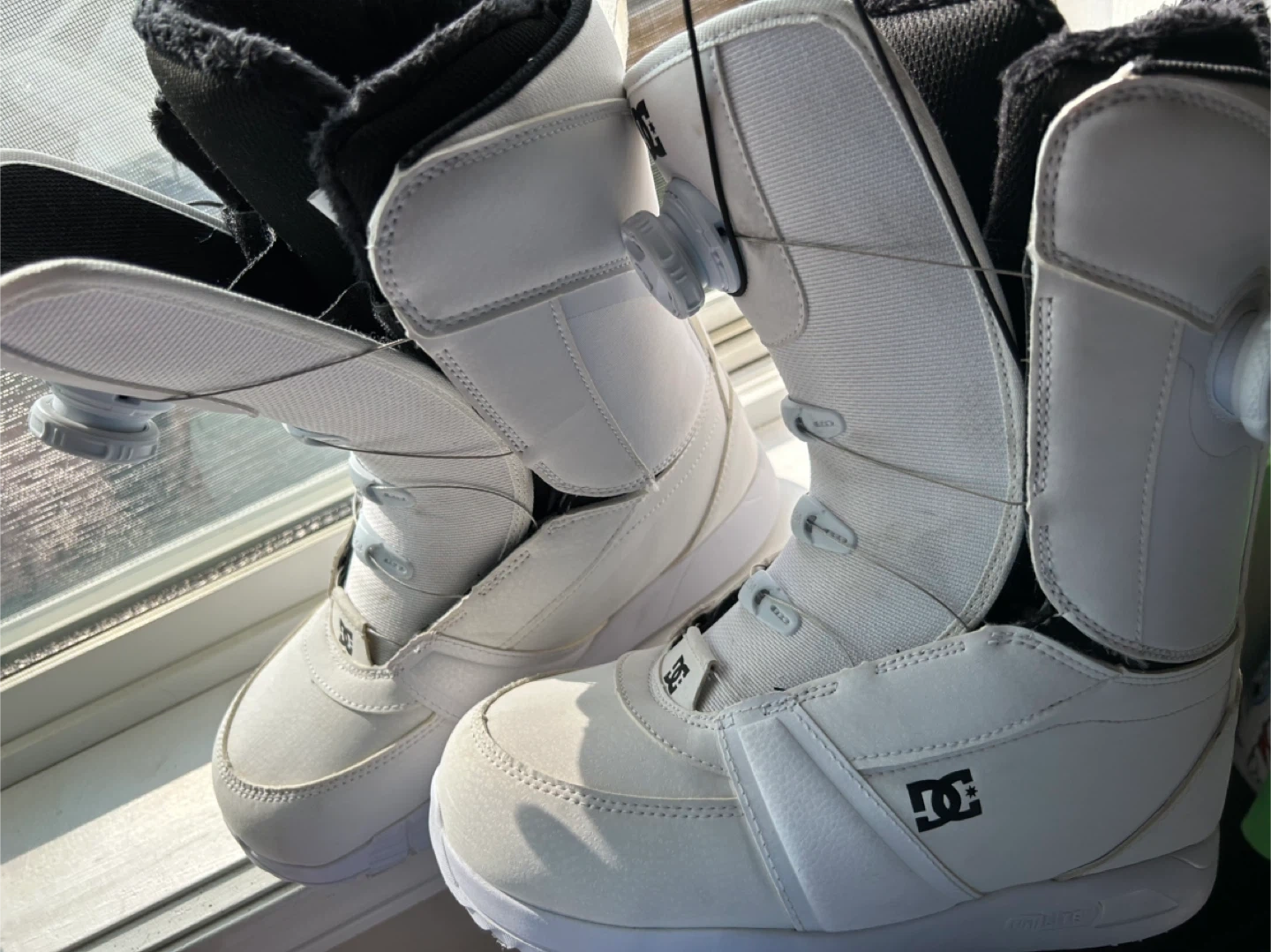 Selling a pair of DC Lotus 2024 women's snowboard boots in white/white. These are size 8.5 US. They come with the original box. Great for hitting the slopes this winter!