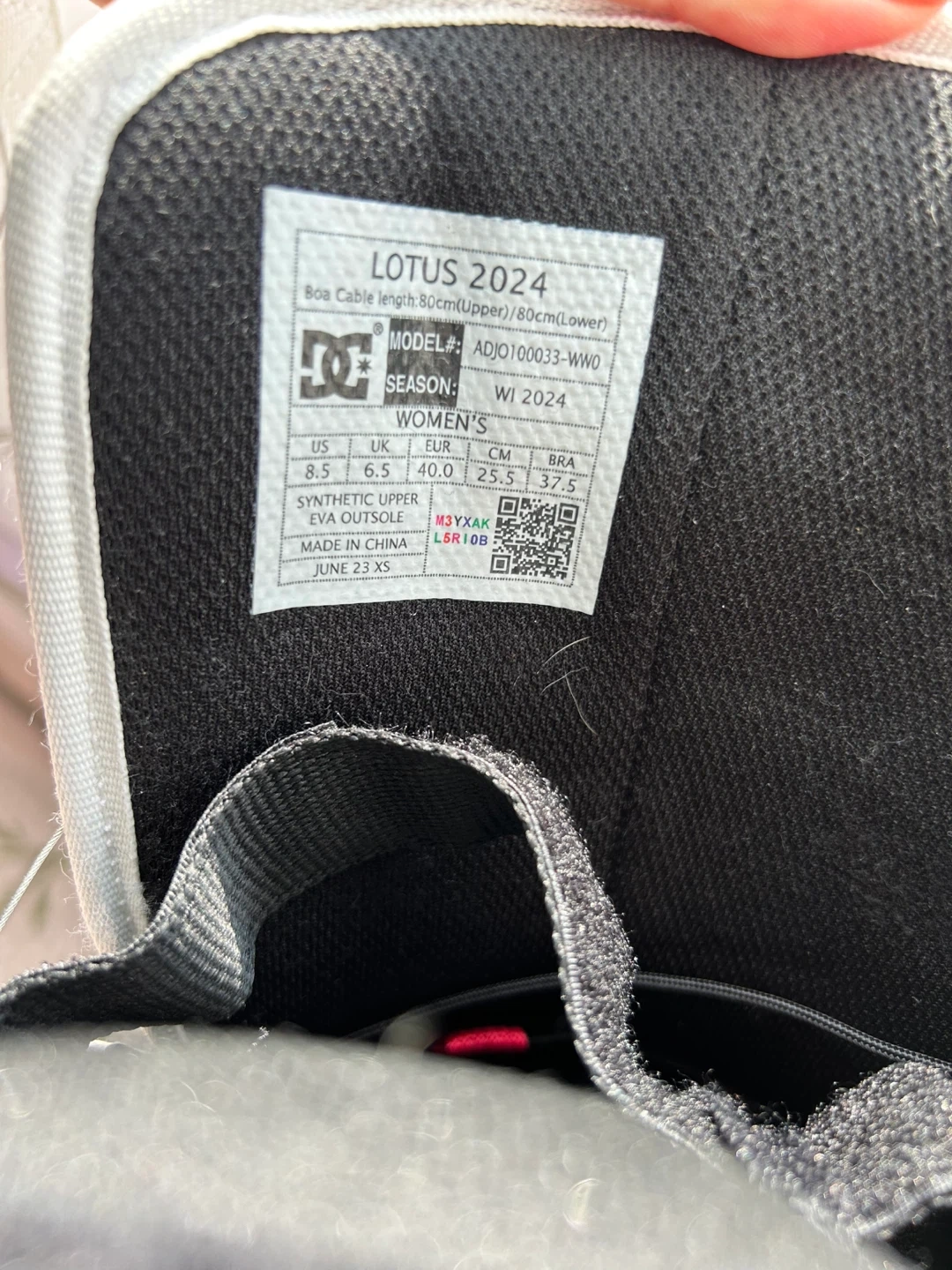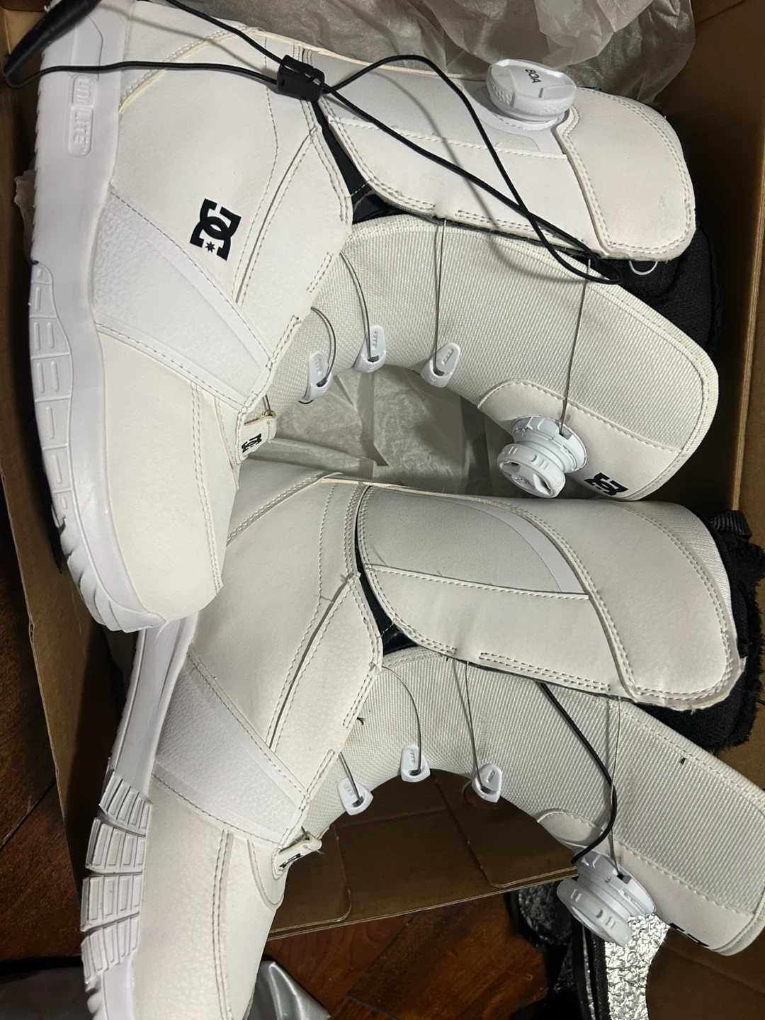 Selling a pair of DC Lotus 2024 women's snowboard boots in white/white. These are size 8.5 US. They come with the original box. Great for hitting the slopes this winter!