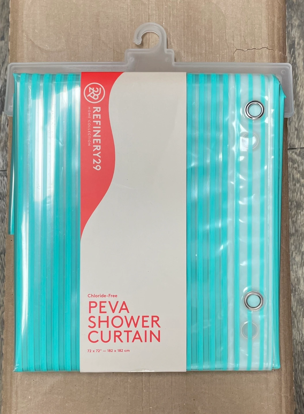 This is a REFINERY29 Home Collection PEVA shower curtain. It's chloride-free and measures 72 x 72 inches (182 x 182 cm). The fiber content is 100% PEVA. Care instructions: Wipe clean with a damp cloth