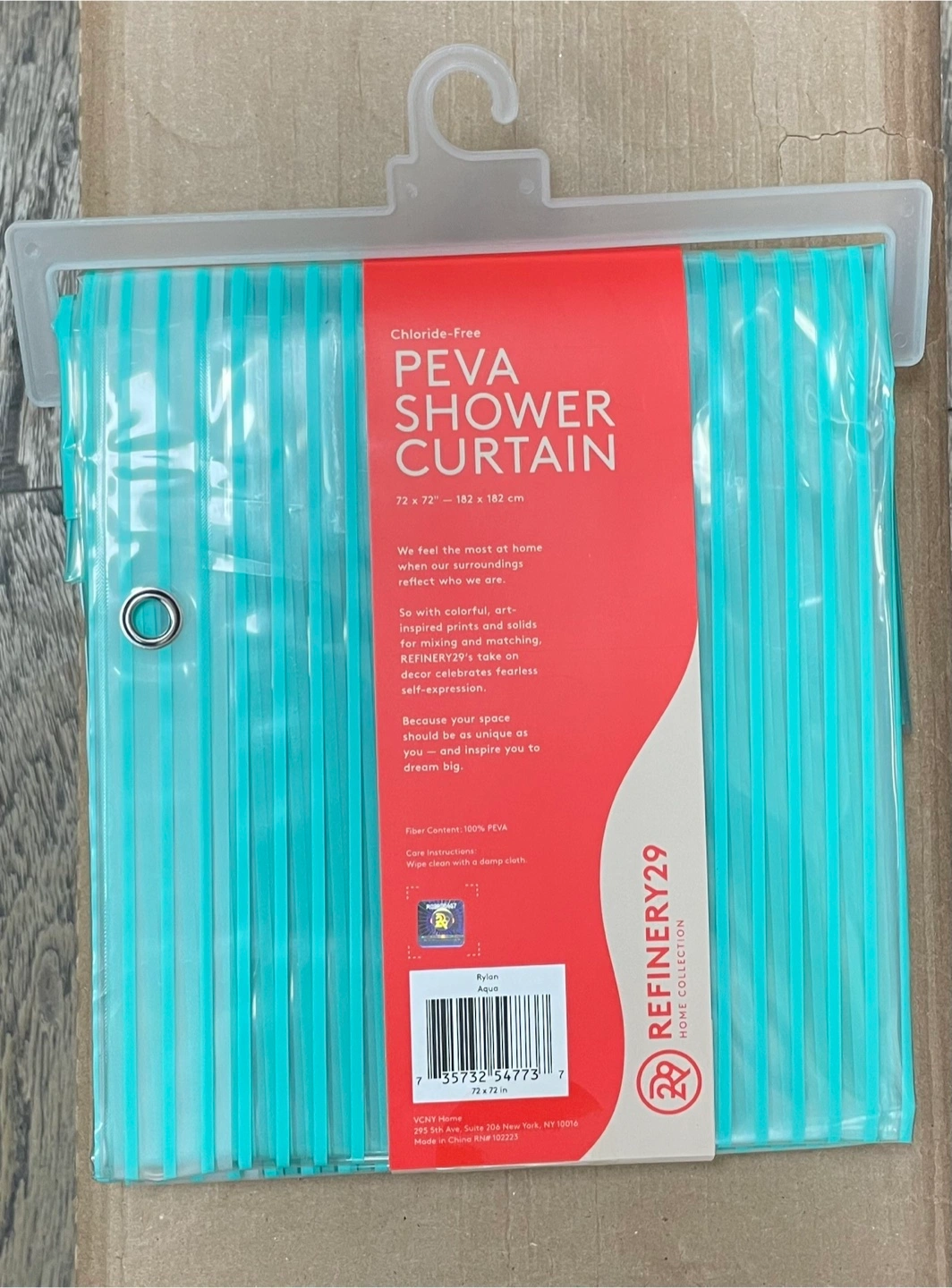 This is a REFINERY29 Home Collection PEVA shower curtain. It's chloride-free and measures 72 x 72 inches (182 x 182 cm). The fiber content is 100% PEVA. Care instructions: Wipe clean with a damp cloth