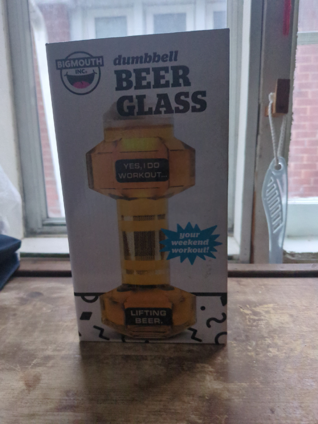 Get ready to lift some beer with this fun dumbbell beer glass from BigMouth Inc! It's perfect for your weekend workout or just relaxing after a long day. The box says, 'Yes, I do workout...lifting beer!'