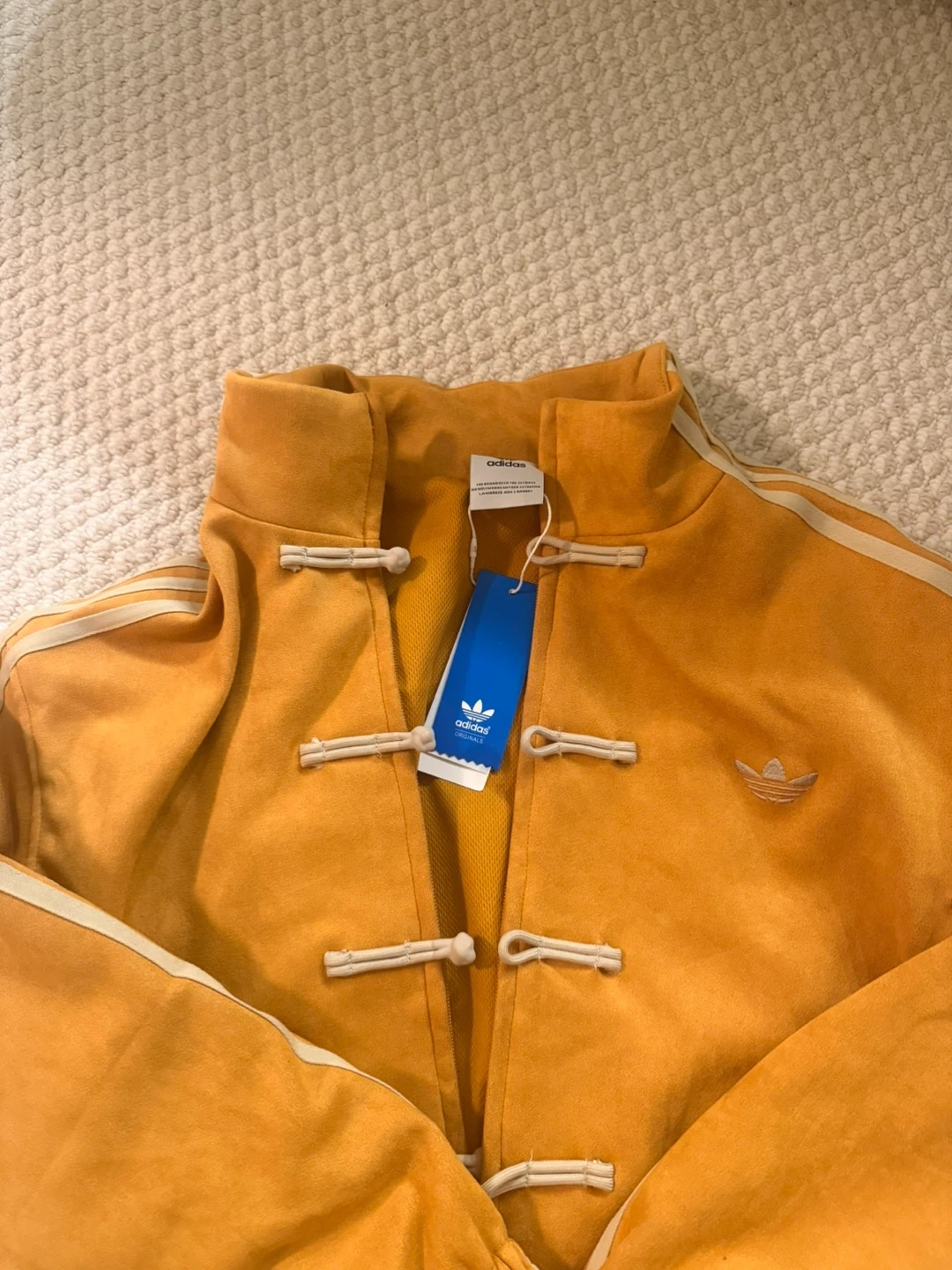 Adidas Originals yellow jacket with classic three stripes on the sleeves. It features a stand-up collar and frog button closures. Size is small.