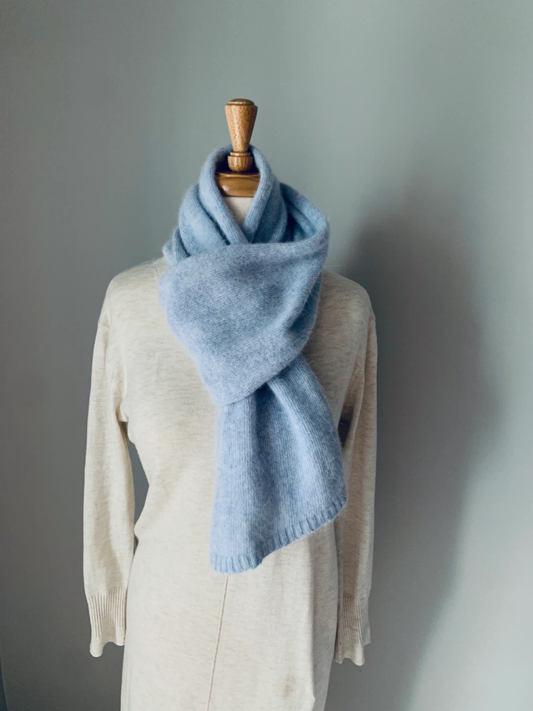 1000+Cozy up with this amazing Baby Blue wool scarf. It is weightless and soft like a cloud. 60% wool, 30% angora, and 10% nylon.