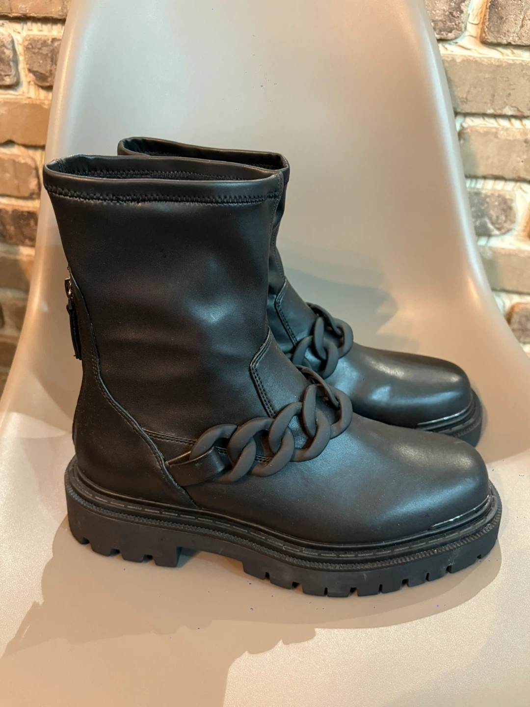 65These black boots from Aldo feature a chunky chain detail. They come in a women’s size 9 and have never been worn before, in excellent condition! Willing to do pick up/drop off in Brampton!
