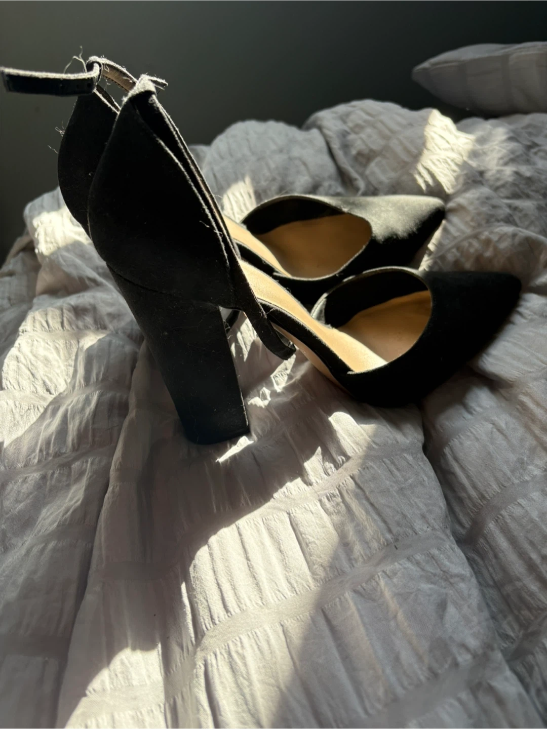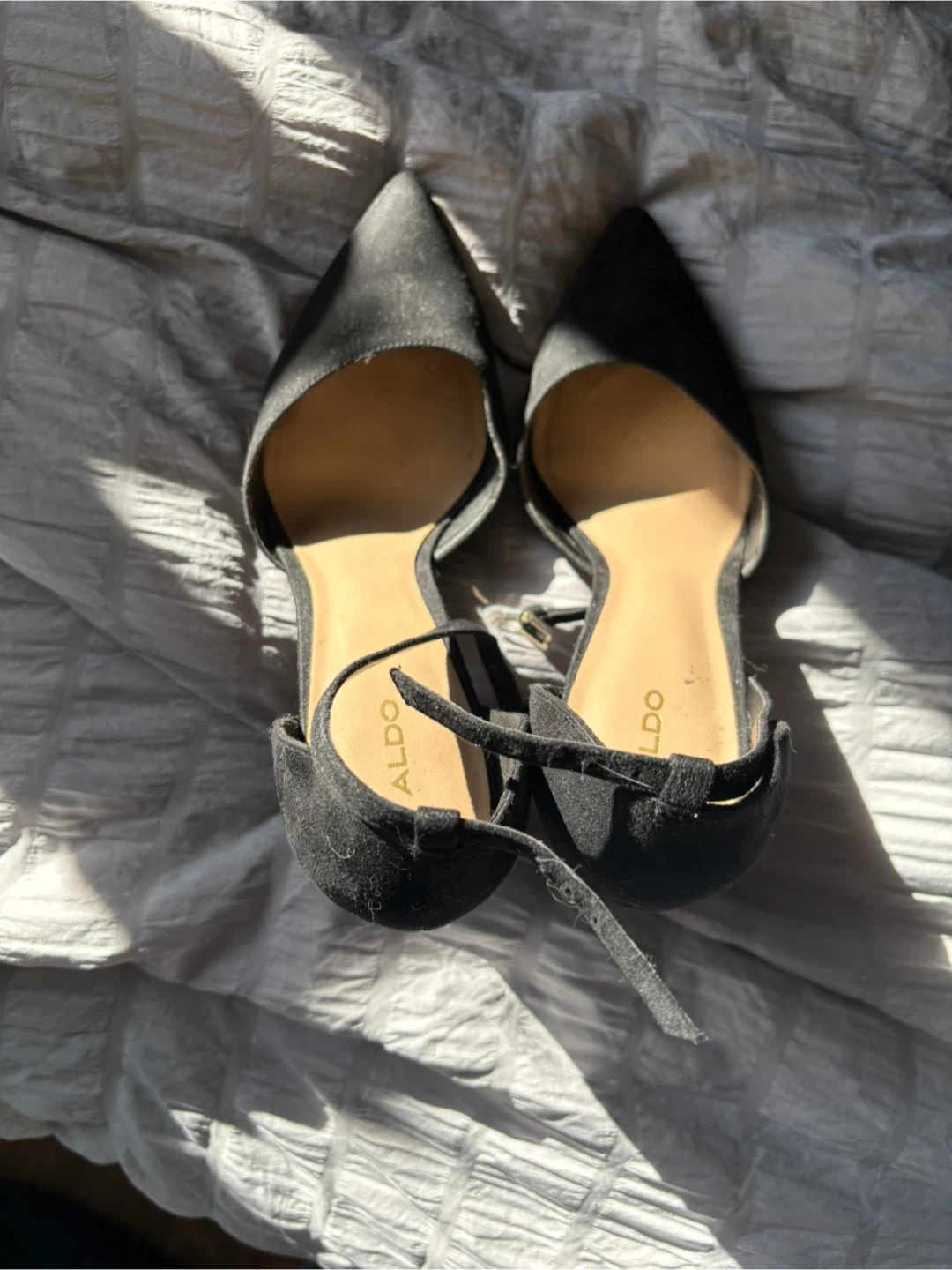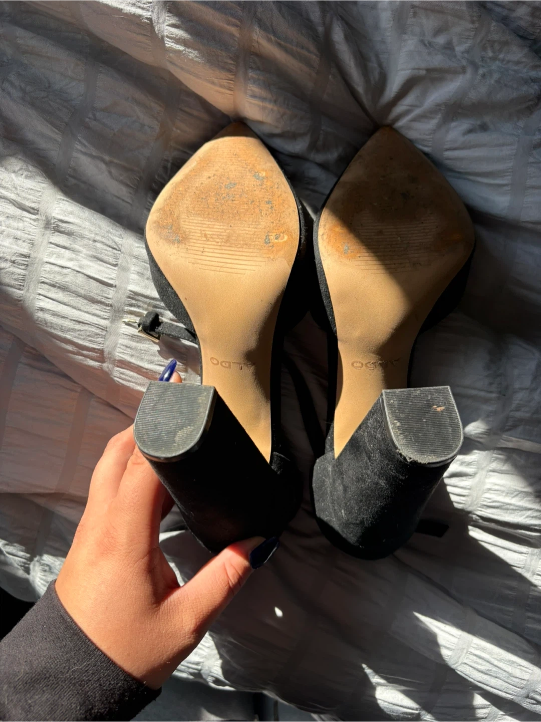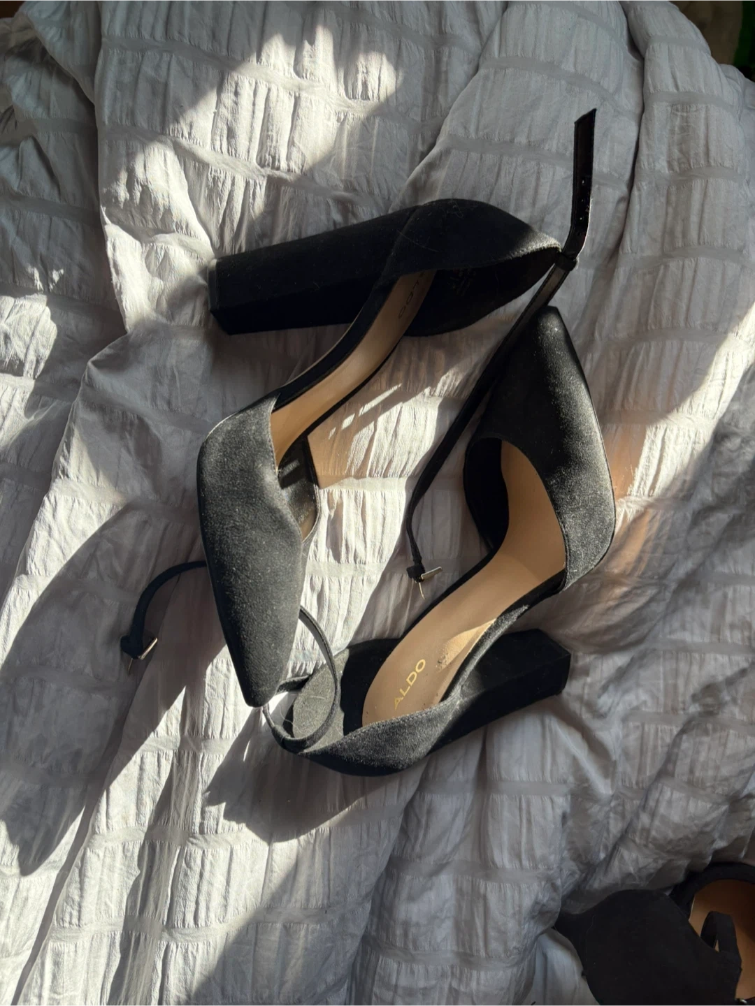 Selling a pair of black heels from ALDO in size 9. They have an ankle strap and a block heel. There are some signs of wear on the soles, but overall they're in good condition!
