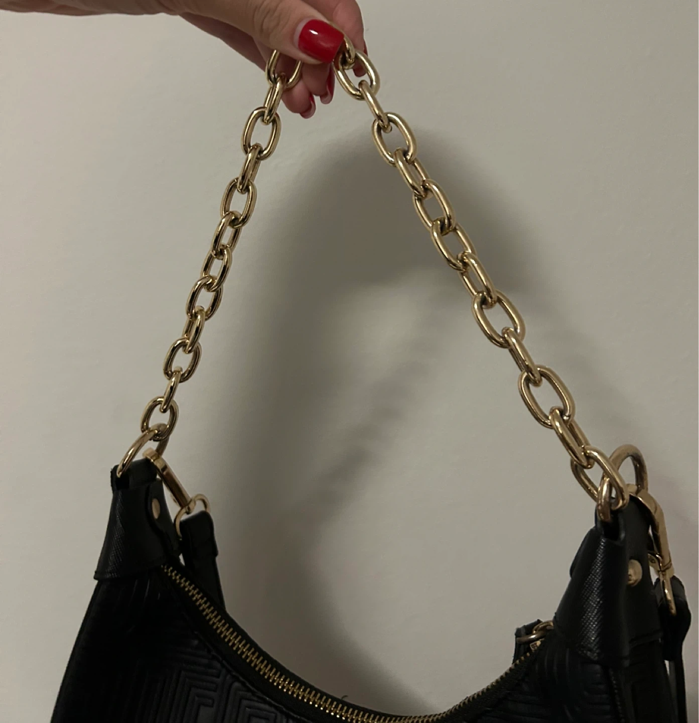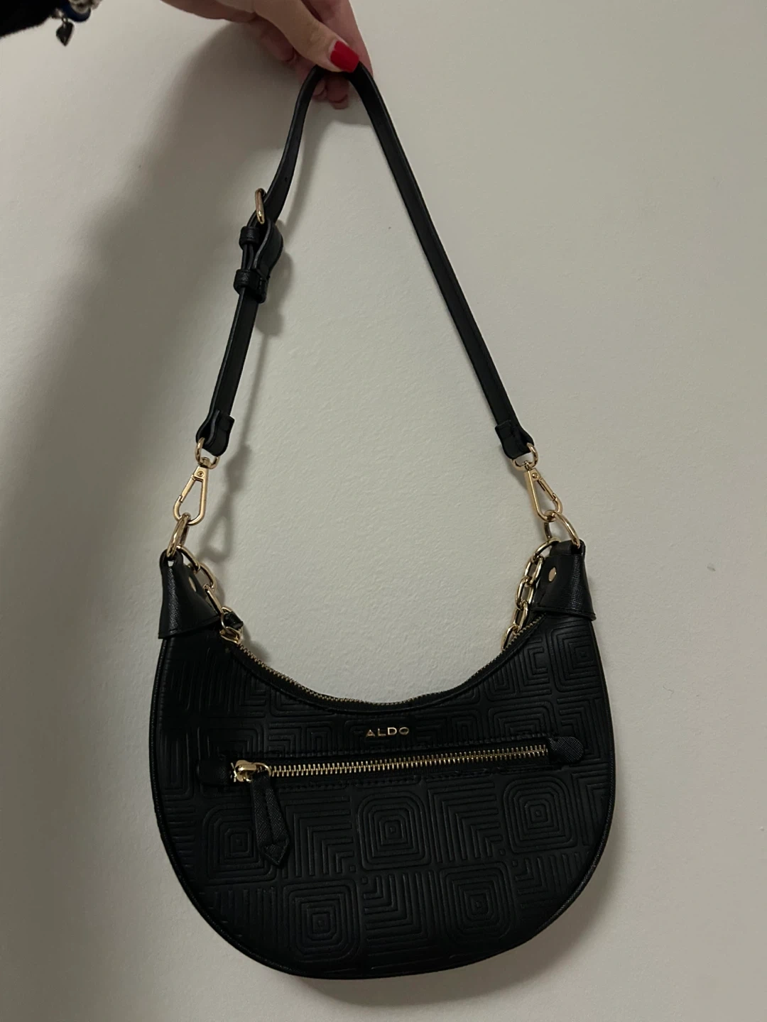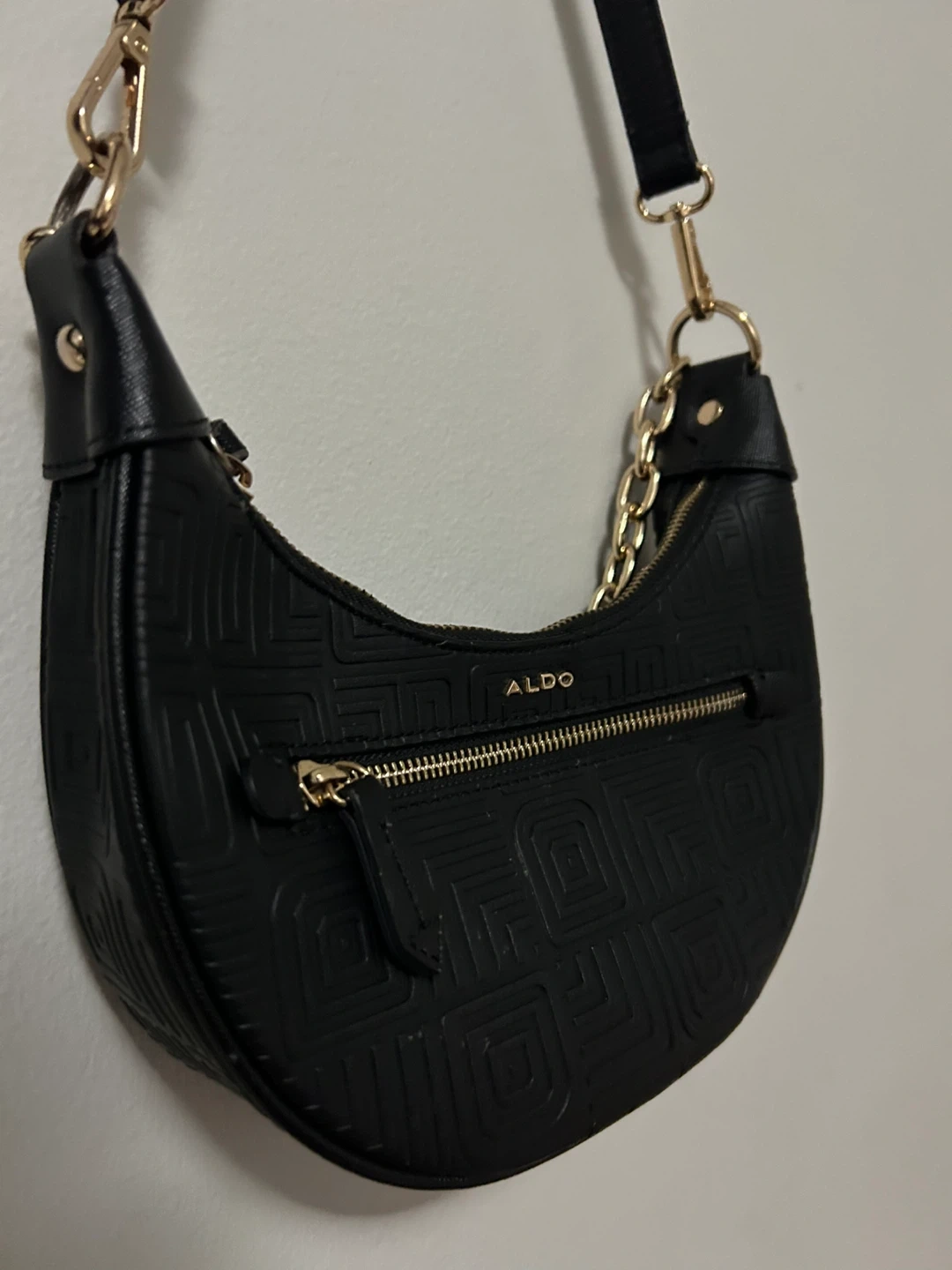 148ALDO black hand/shoulder bag in good condition. Has a unique patterned design, features a gold chain and an adjustable black strap that can be detached. One big pocket and two small. Has slight signs of wear.