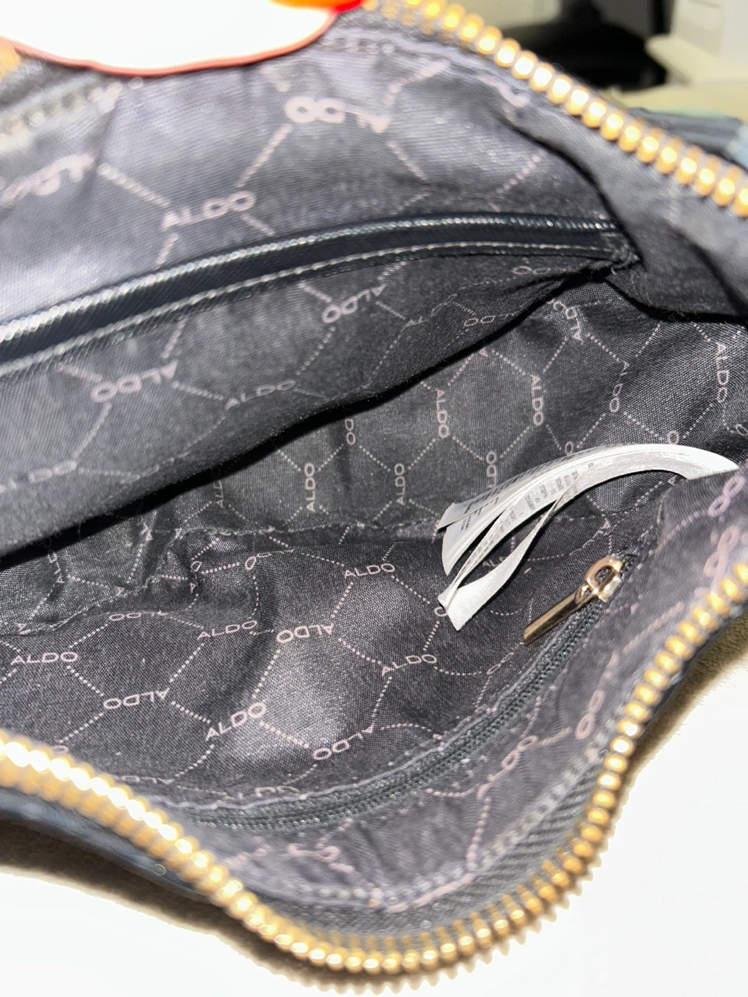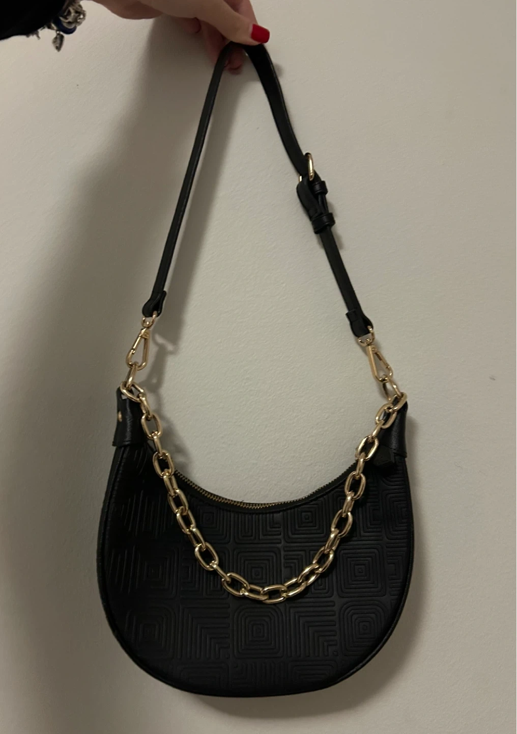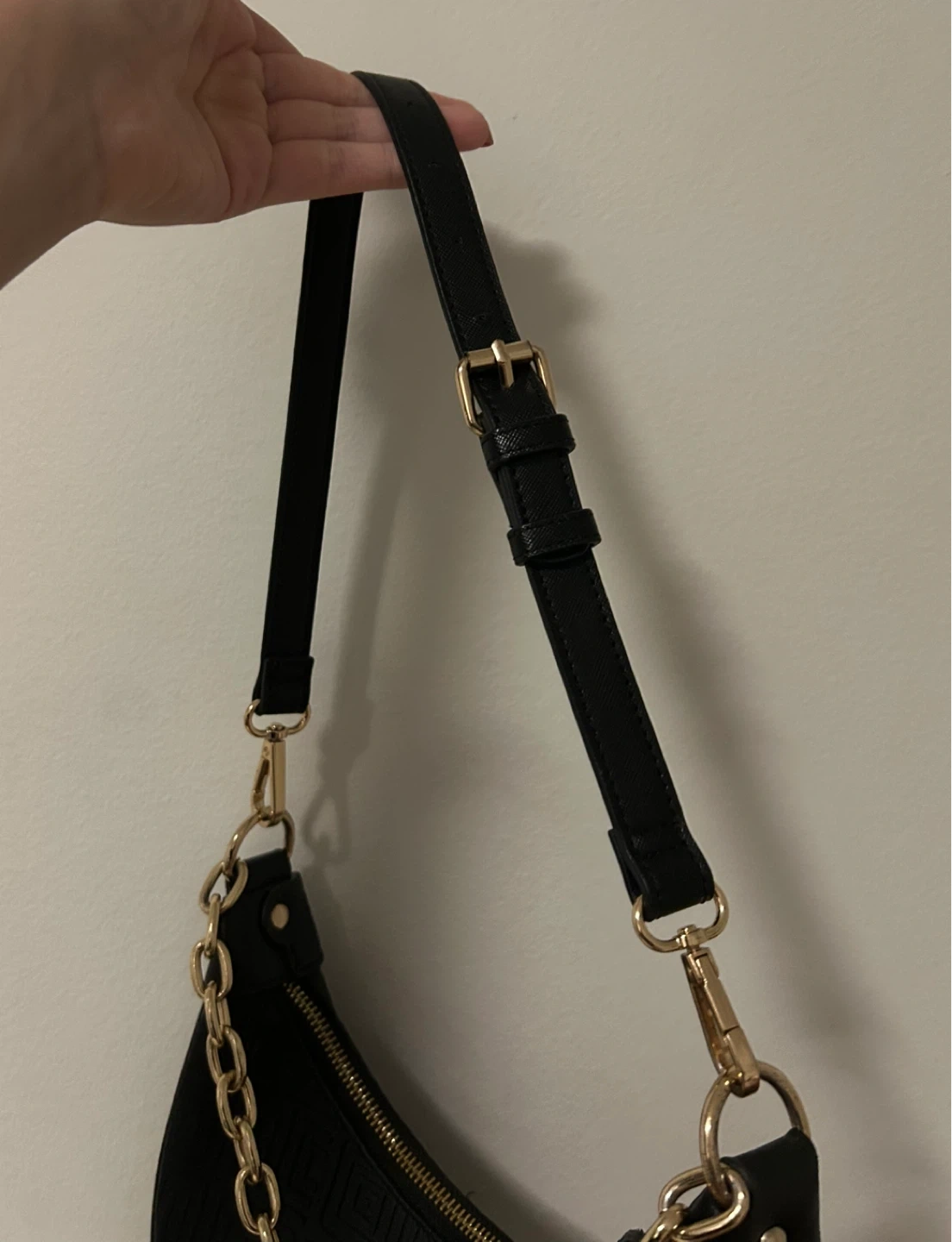 148ALDO black hand/shoulder bag in good condition. Has a unique patterned design, features a gold chain and an adjustable black strap that can be detached. One big pocket and two small. Has slight signs of wear.