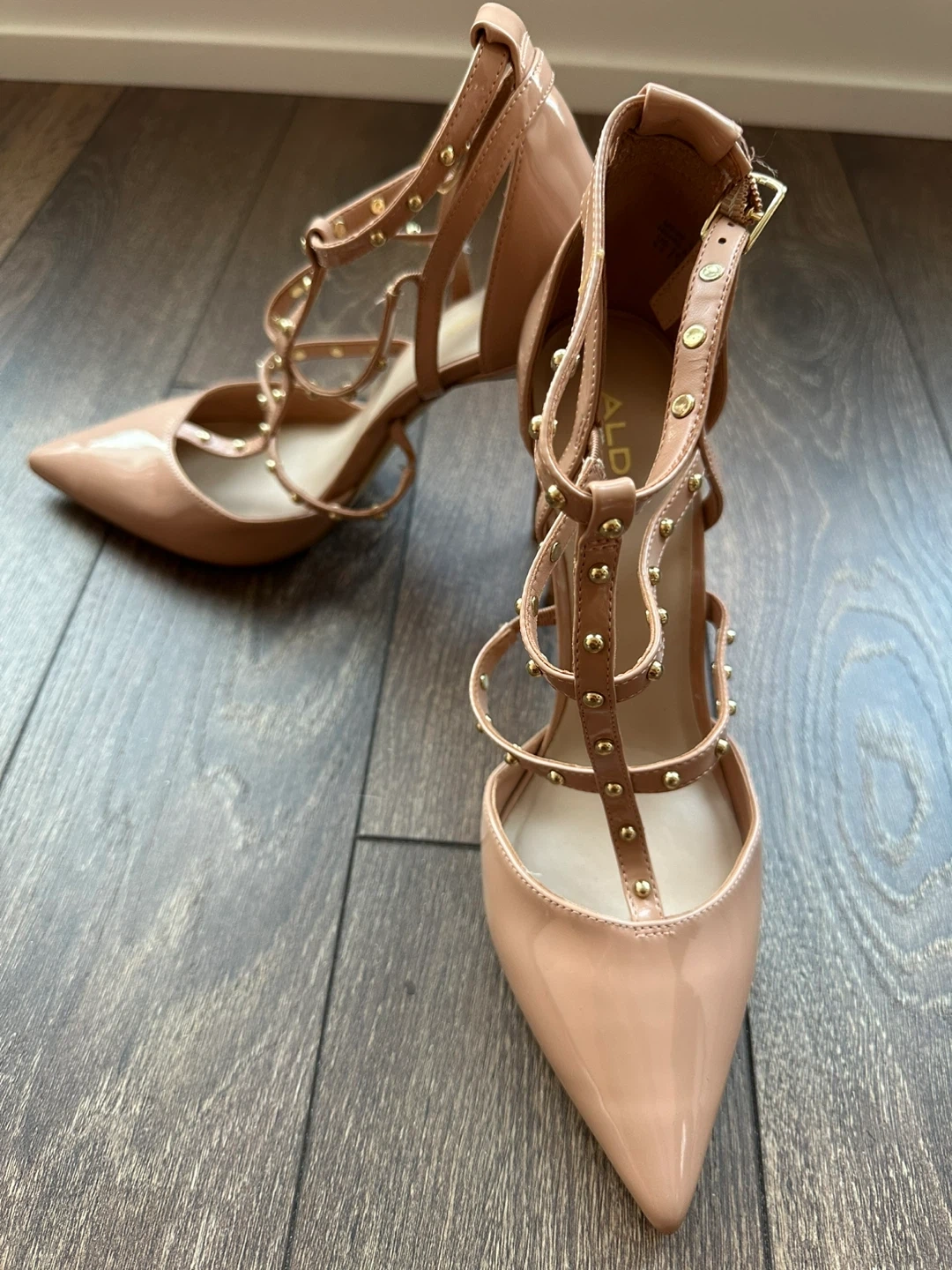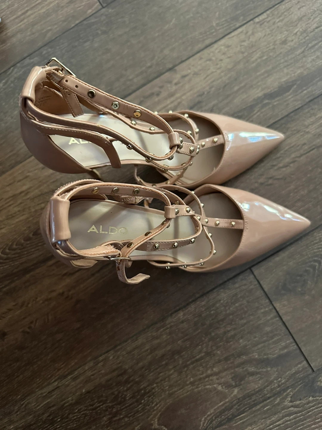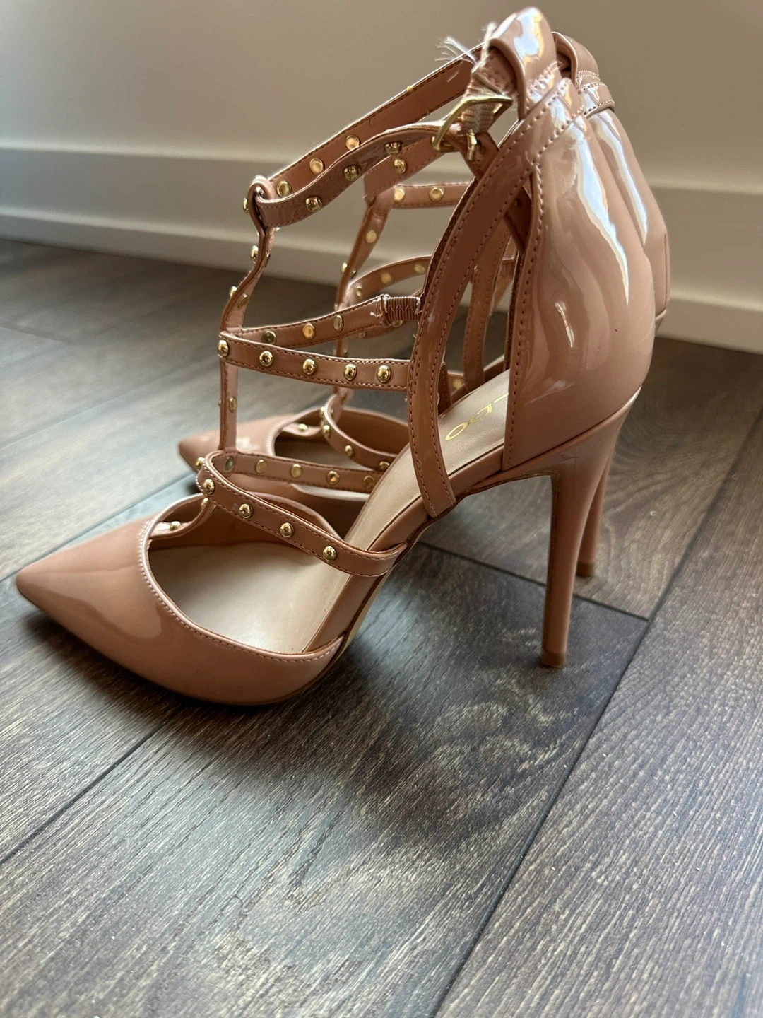 28These Aldo heels are super cute and in great shape! They're a size 8,5 and feature a stylish design with delicate straps and gold-tone studs. Perfect for dressing up any outfit!