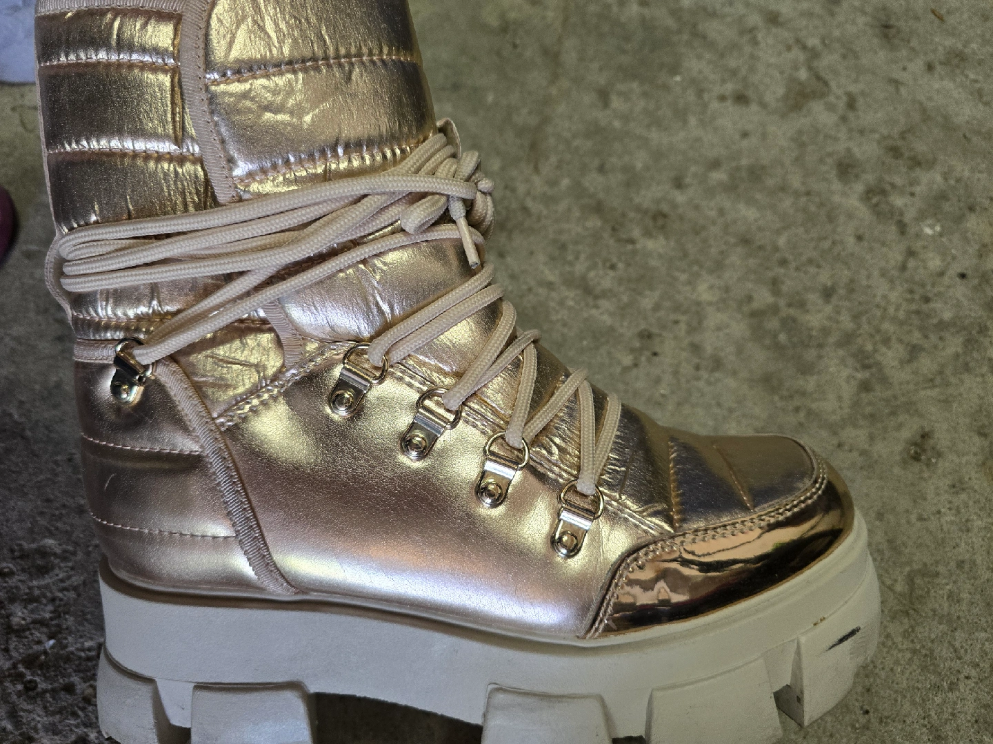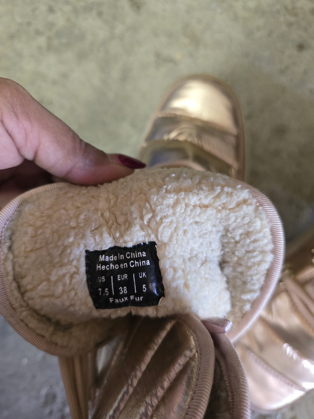 10Selling a pair of Aldo platform boots in a stylish rose gold colour! They're a women's size 7.5. The boots are made in China and feature a faux fur lining for extra warmth and comfort.