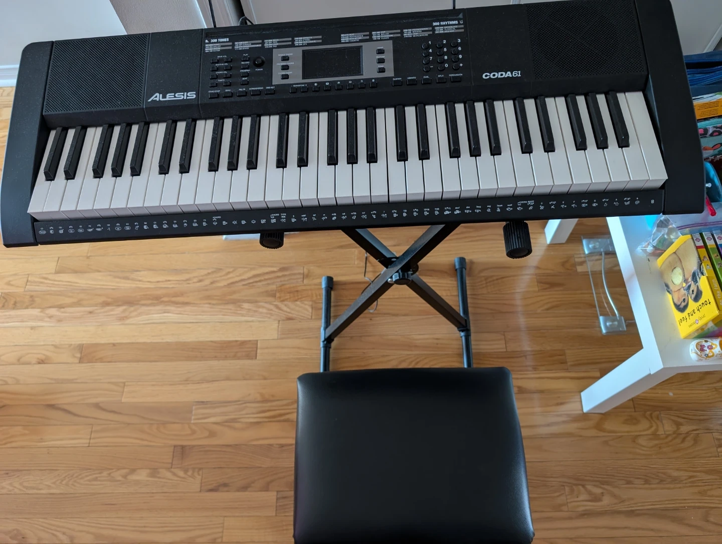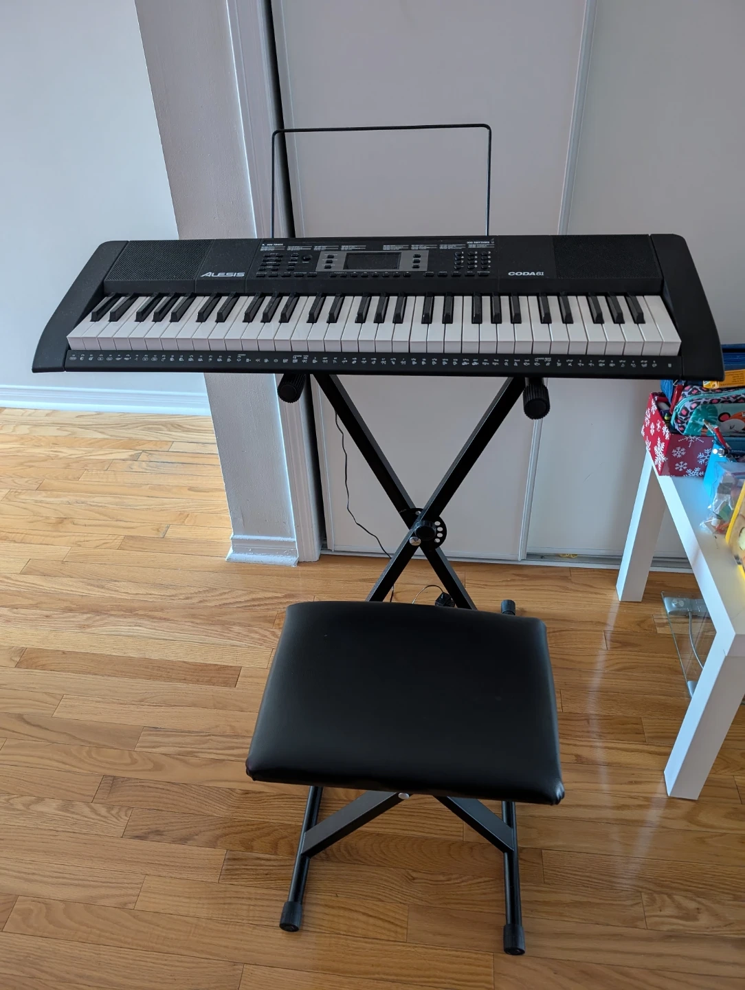 Selling an Alesis Coda 61 keyboard. It comes with a stand and bench, so you'll have everything you need to start playing right away! Great for beginners or anyone looking for a portable keyboard.