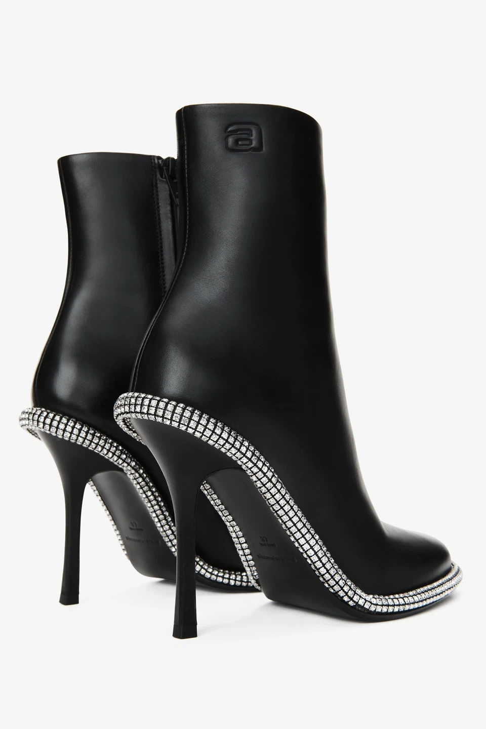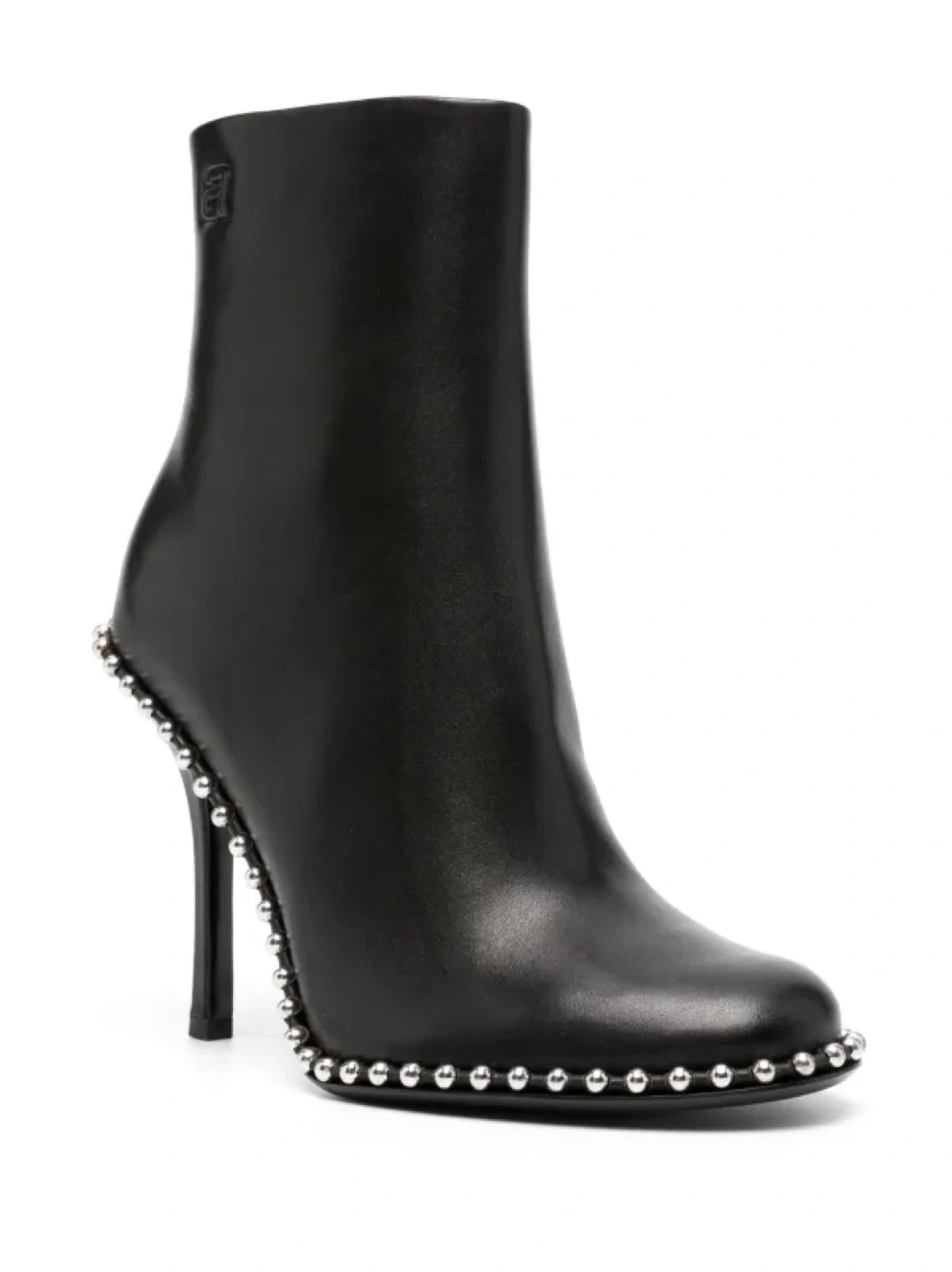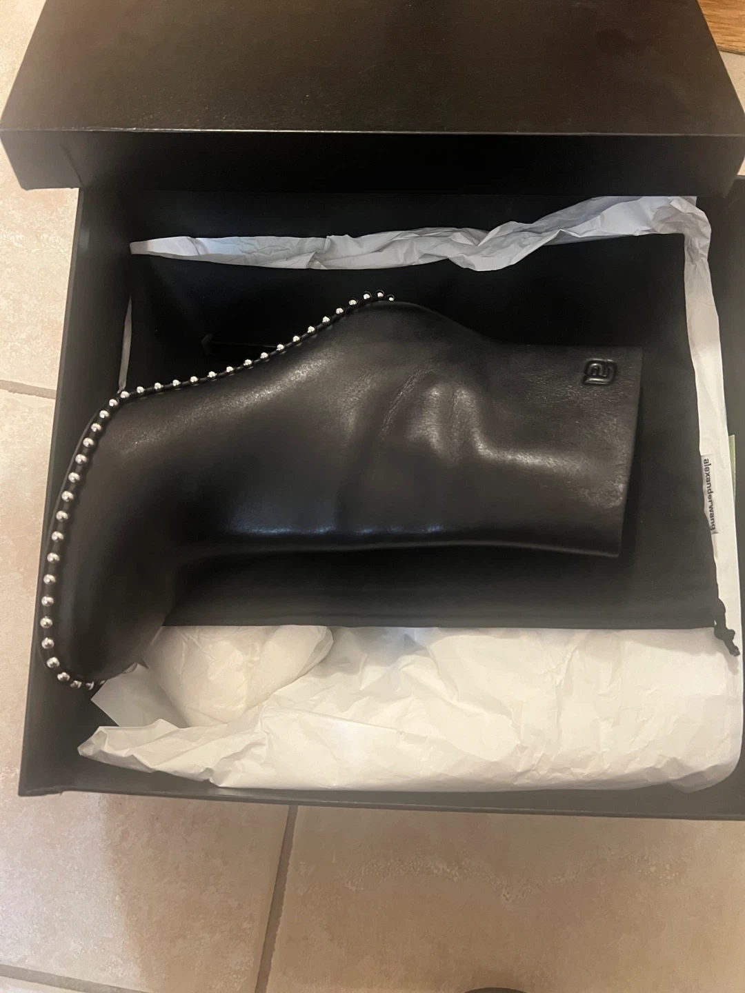 15These Alexander Wang black leather ankle boots are in great condition and come with the original box! They feature a unique design with silver embellishments along the sole and heel. Perfect for adding a touch of edgy style to any outfit