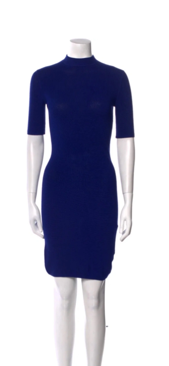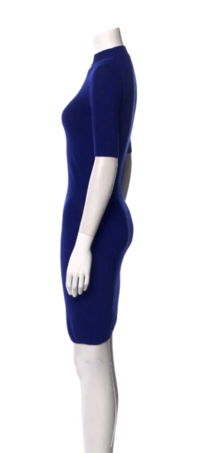 91Blue knitted dress with a mock neck and short sleeves. The dress is fitted and has a midi length with three quarter sleeves. The item has some wear and the retail price is $795. Can provide more pictures upon request. Size xs with a lot of stretch.
