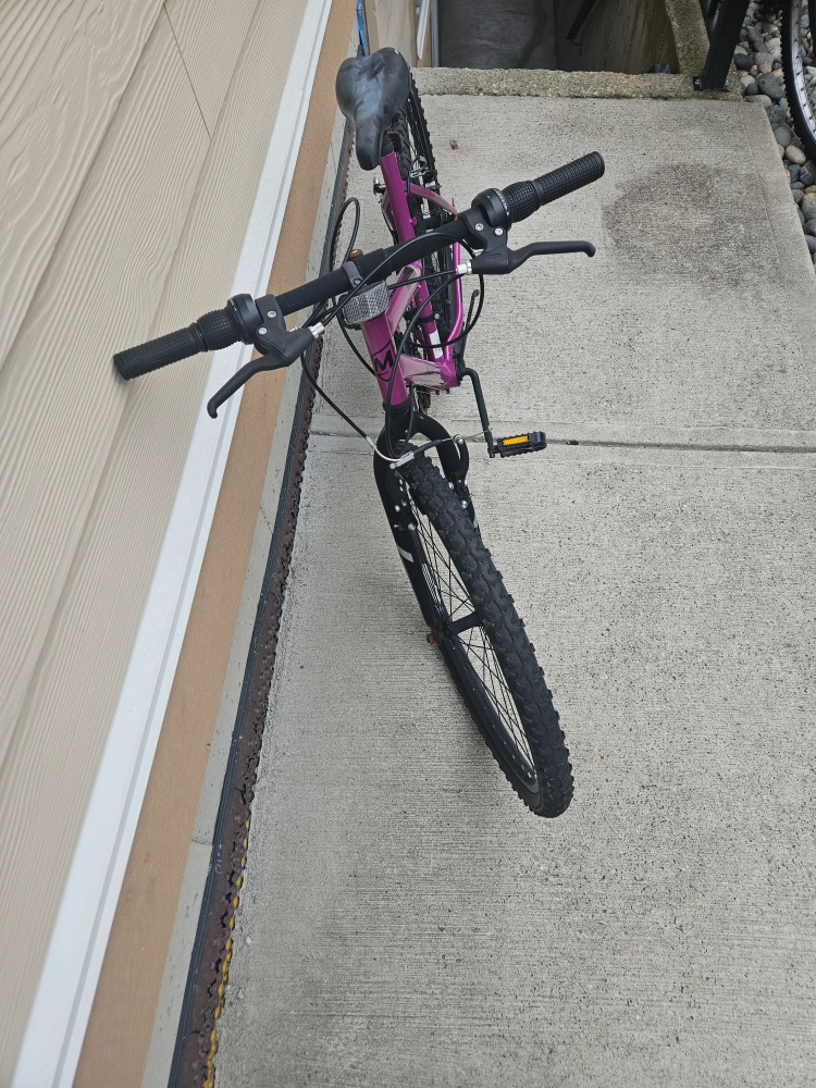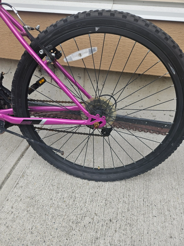 Selling a purple Algonquin mountain bike. It's got a sturdy steel construction and is ready for some fun rides! bike needs some repairs: new brake pad, new replaced tire for tube for back tire, rusty chain and other rusty elements.