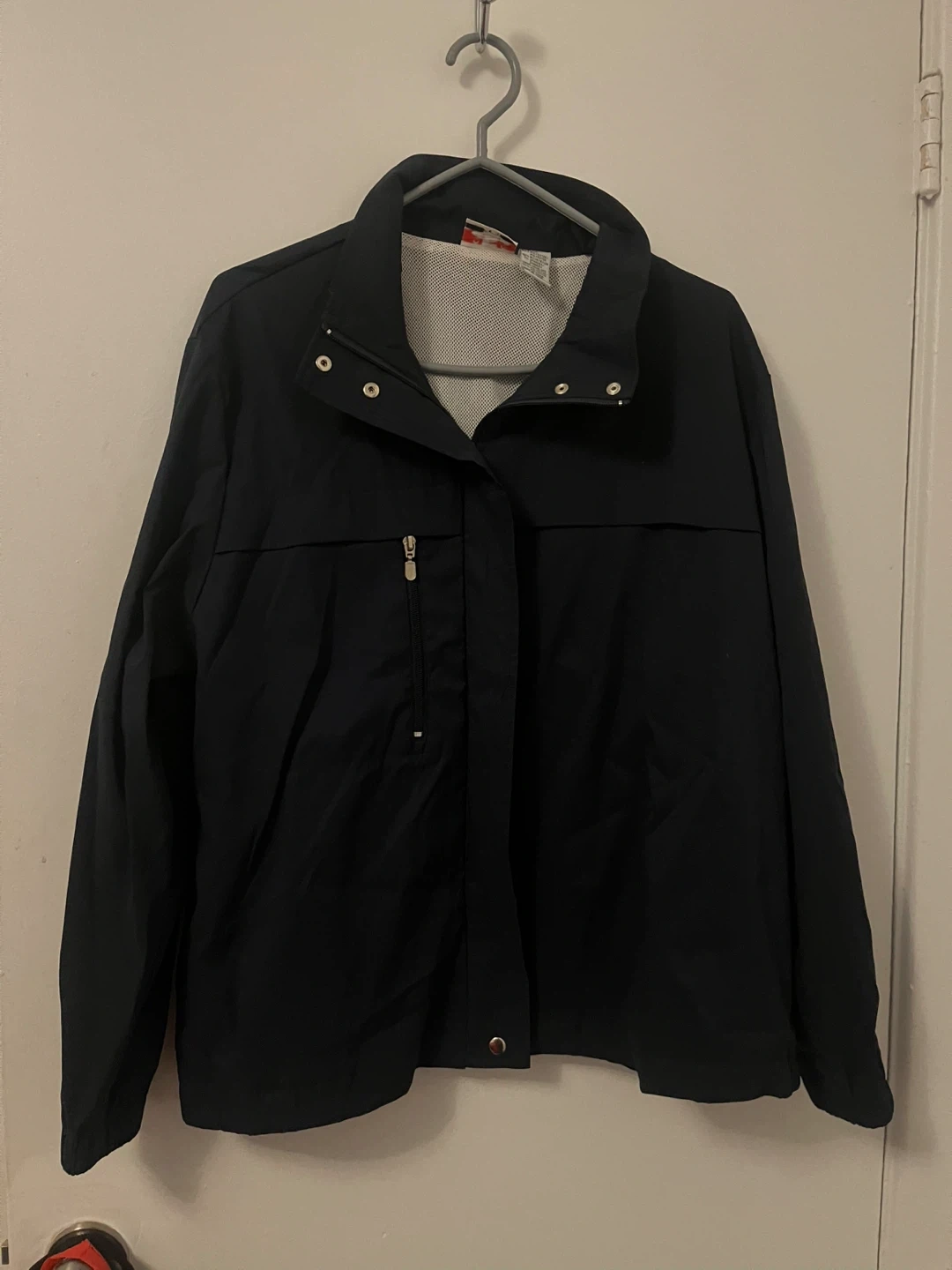 Selling a navy Alia Sport jacket in size 14. The outer shell is made of 53% polyester, 40% nylon, and 7% spandex. The lining is 100% polyester. It's in great condition and ready for a new home!
