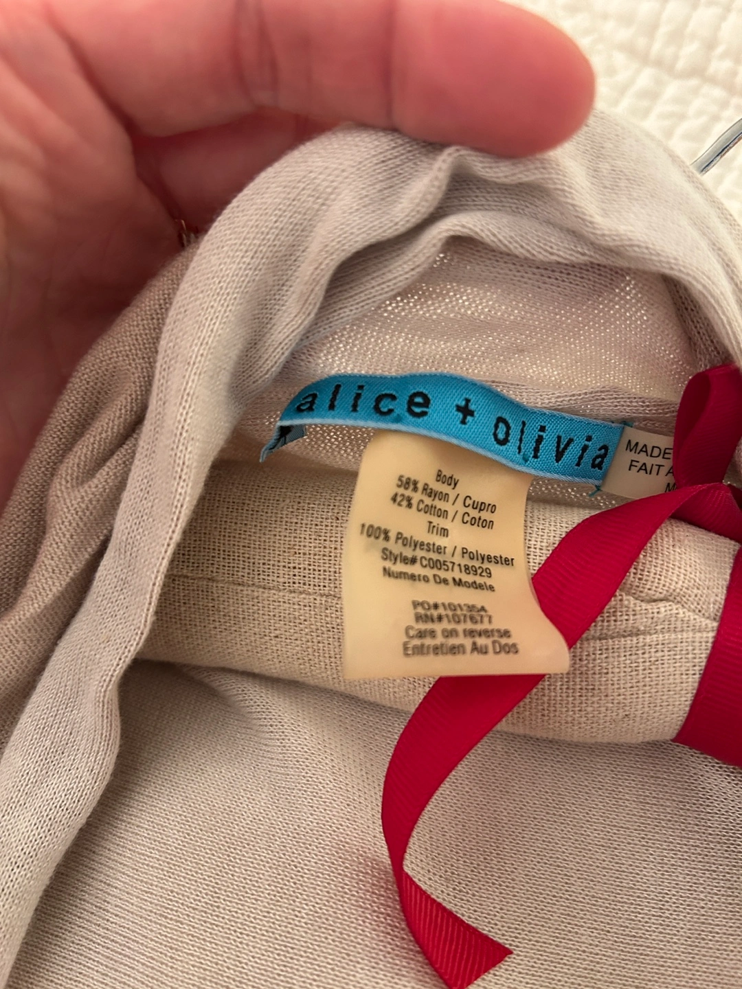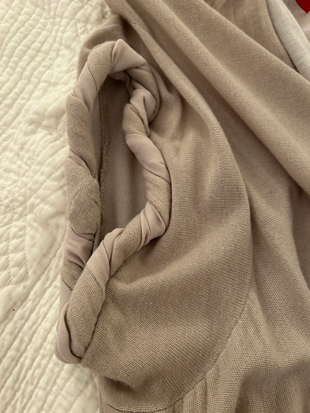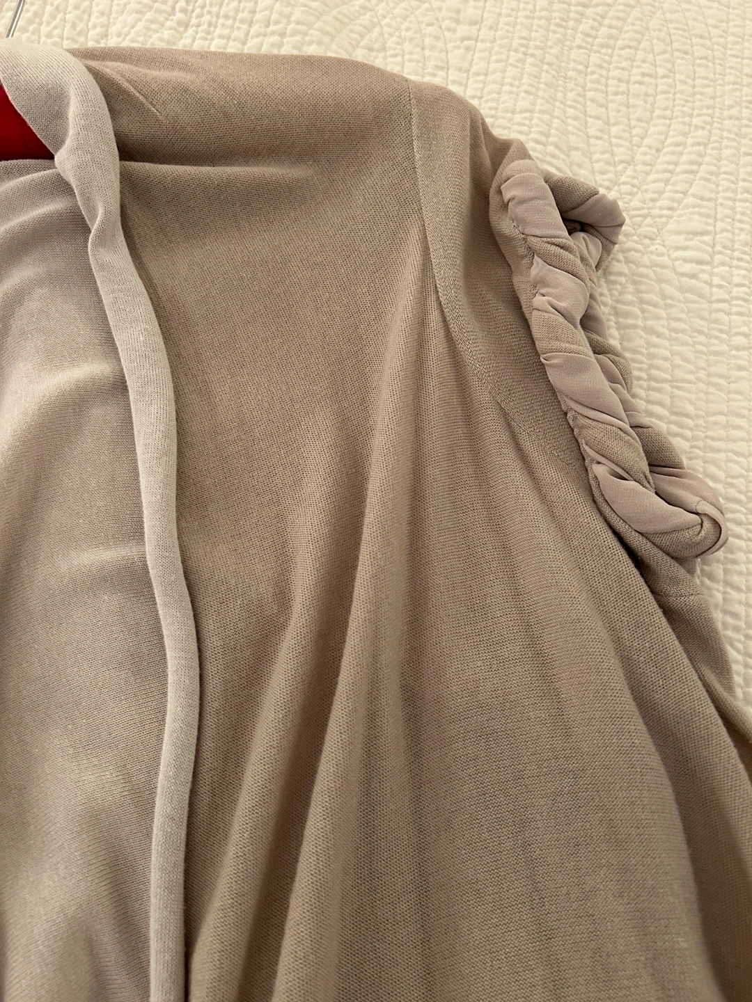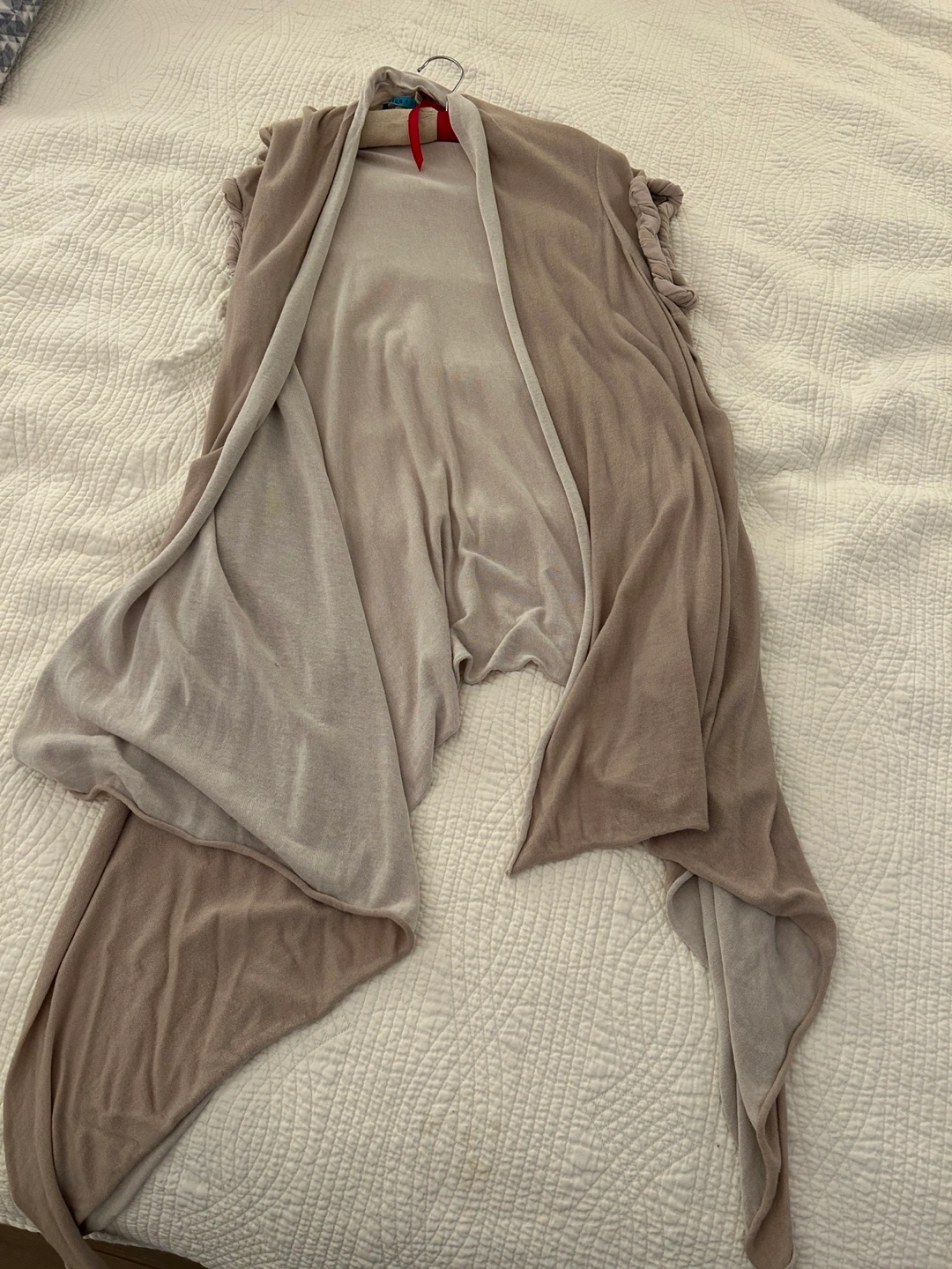 Beautiful sleeveless long cardigan. Neutral taupe and beige colour. Asymmetrical hemline. Unique twisted sleeve detail. Soft and lightweight knit fabric. Size M. Pick up in the Beaches at Queen and Victoria Park.