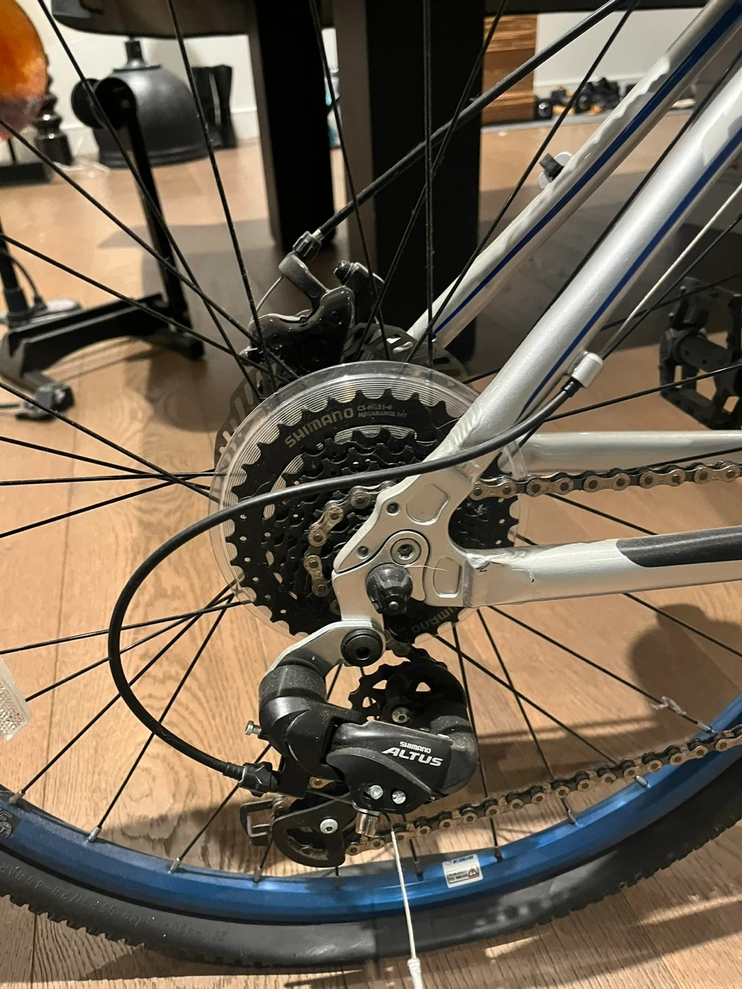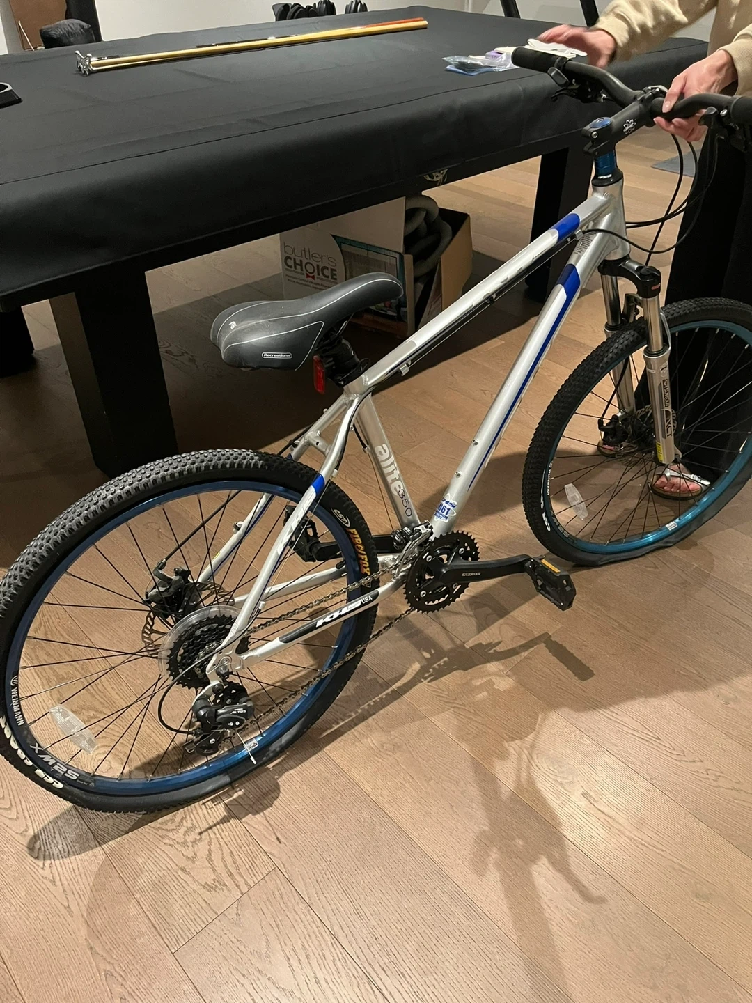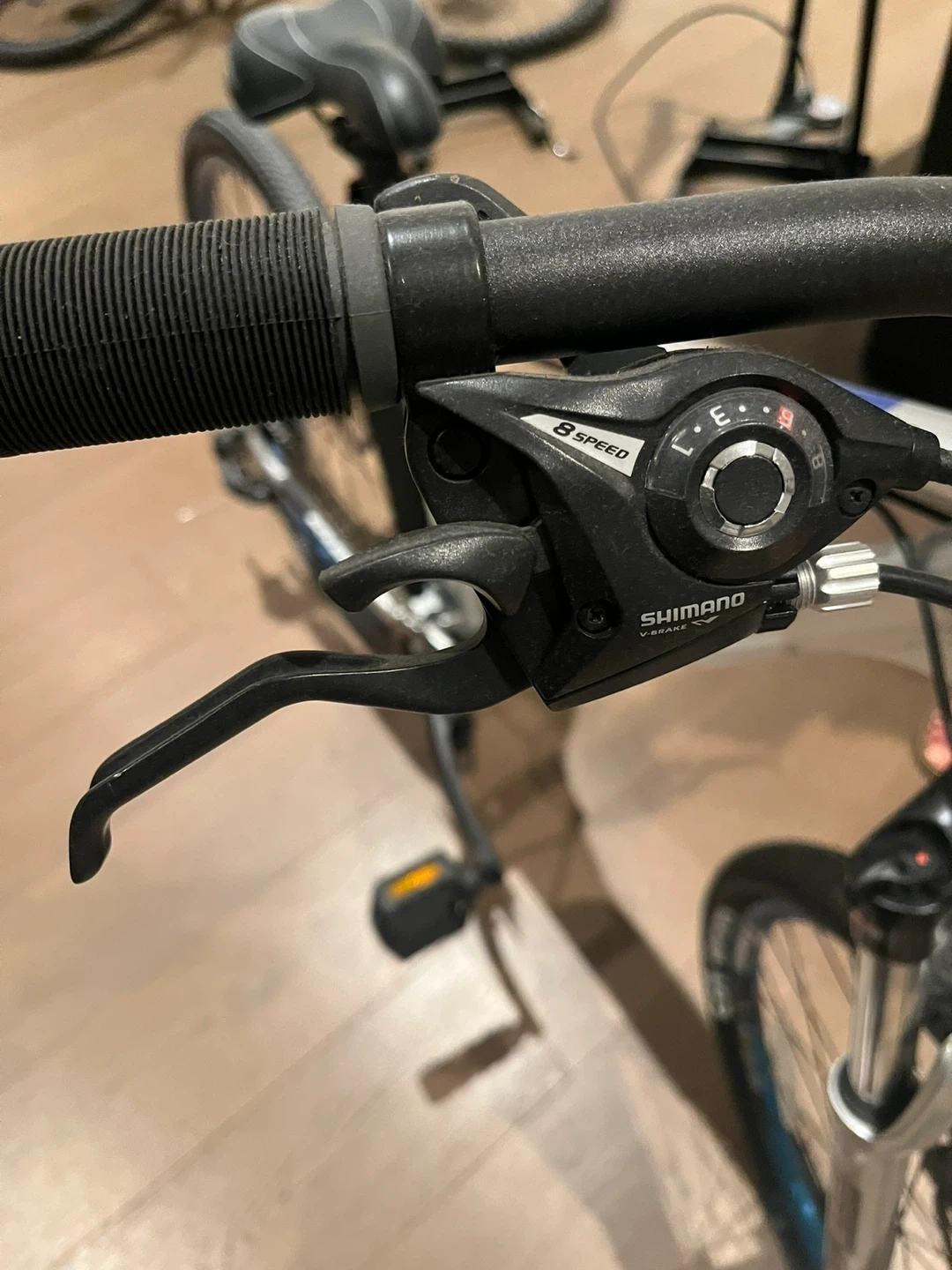 71Selling an Alite 350 mountain bike in silver and blue. It features Shimano components for reliable shifting and SR Suntour XCT front suspension for a smoother ride. The tires are CST Sport. Perfect for trails or city riding!