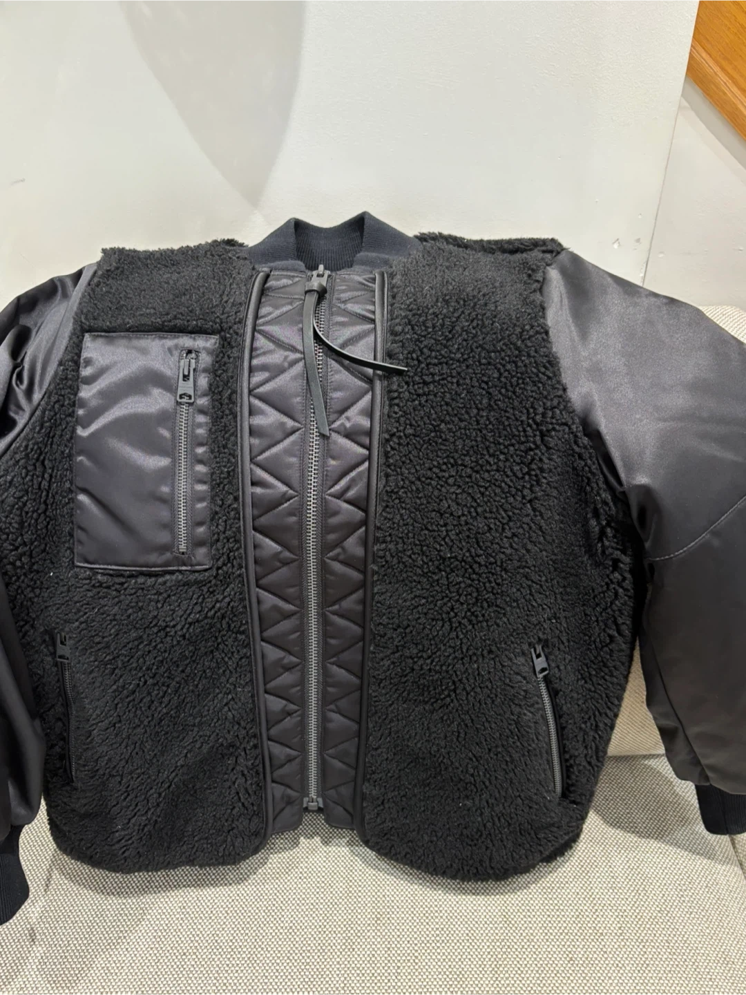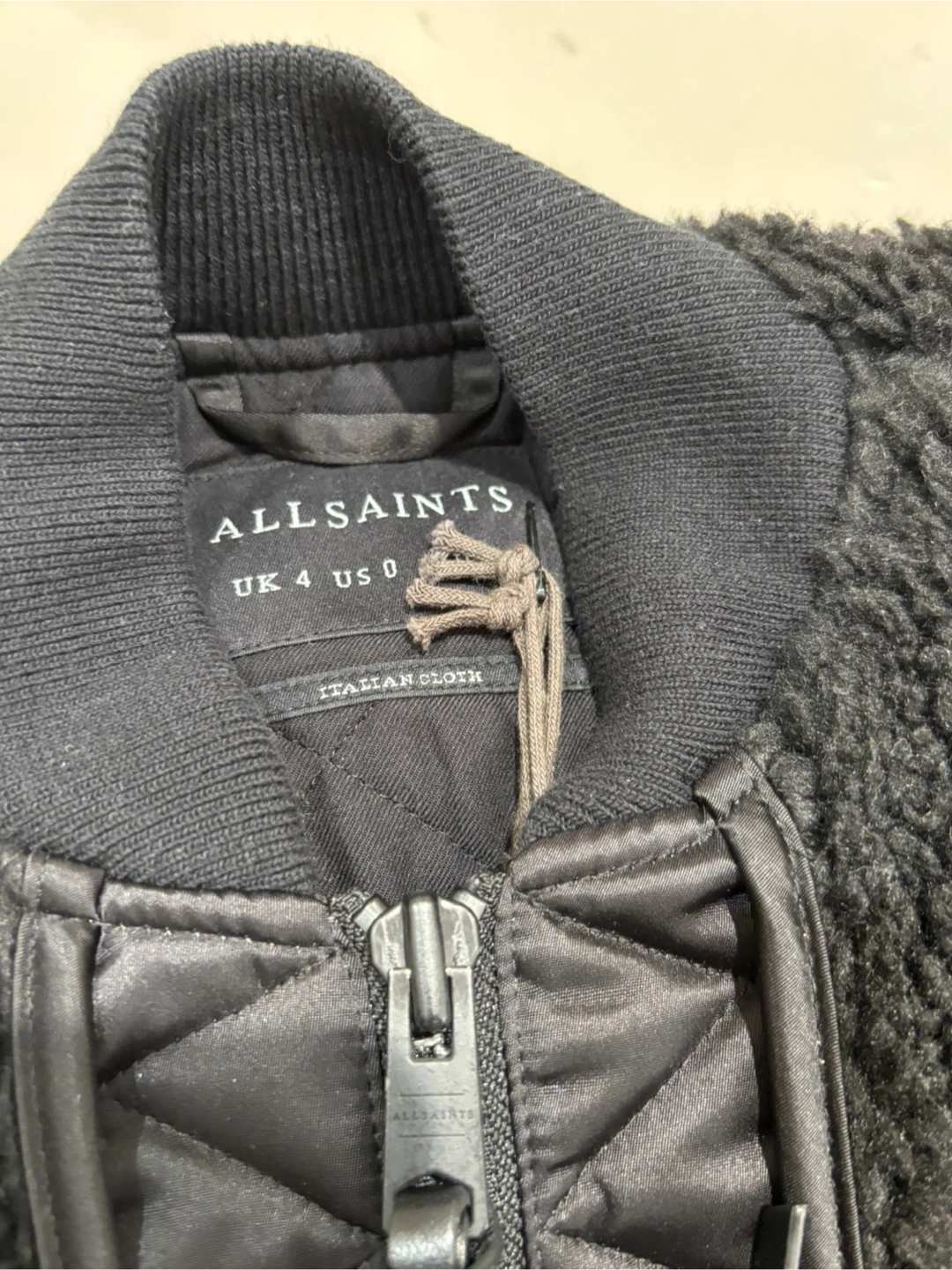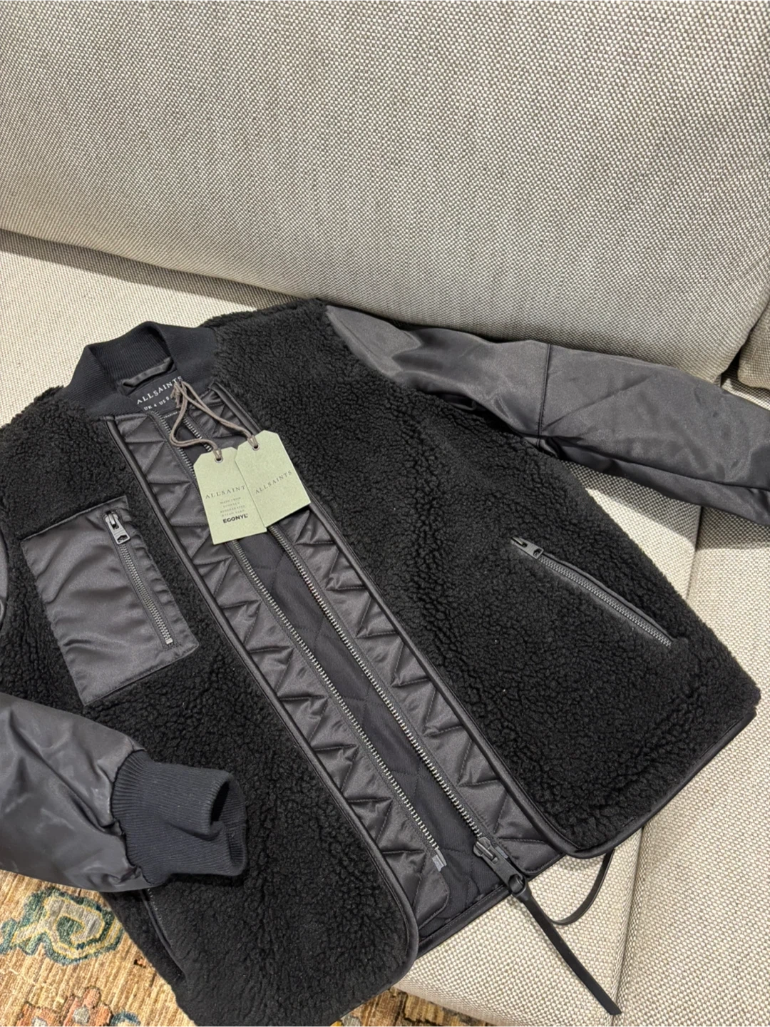 21All Saints Suri black bomber jacket in size US 0. The jacket is made of Econyl and sherpa like material, a unique design with a mix of textures and materials. Perfect for adding a stylish edge to your wardrobe!