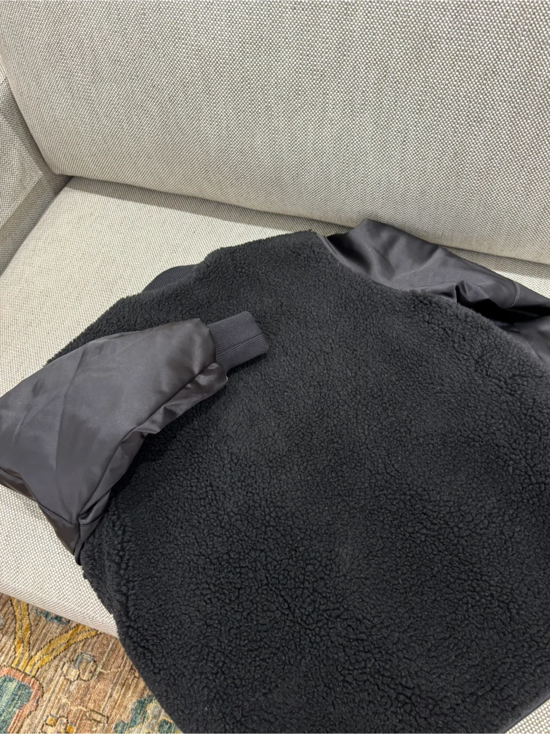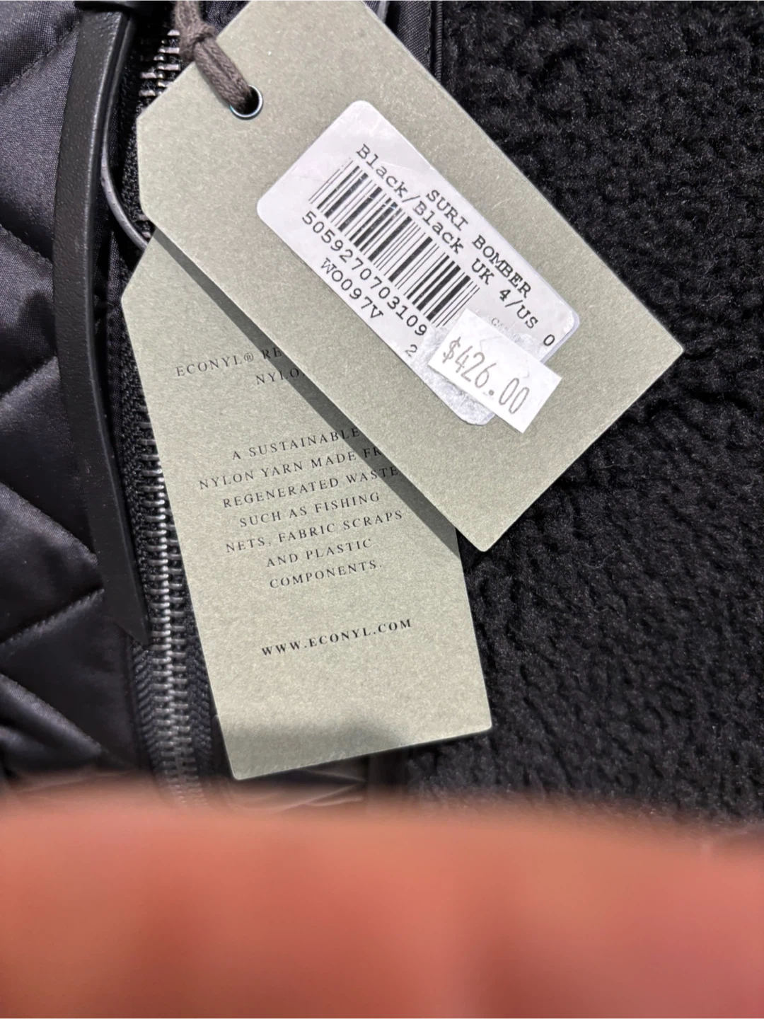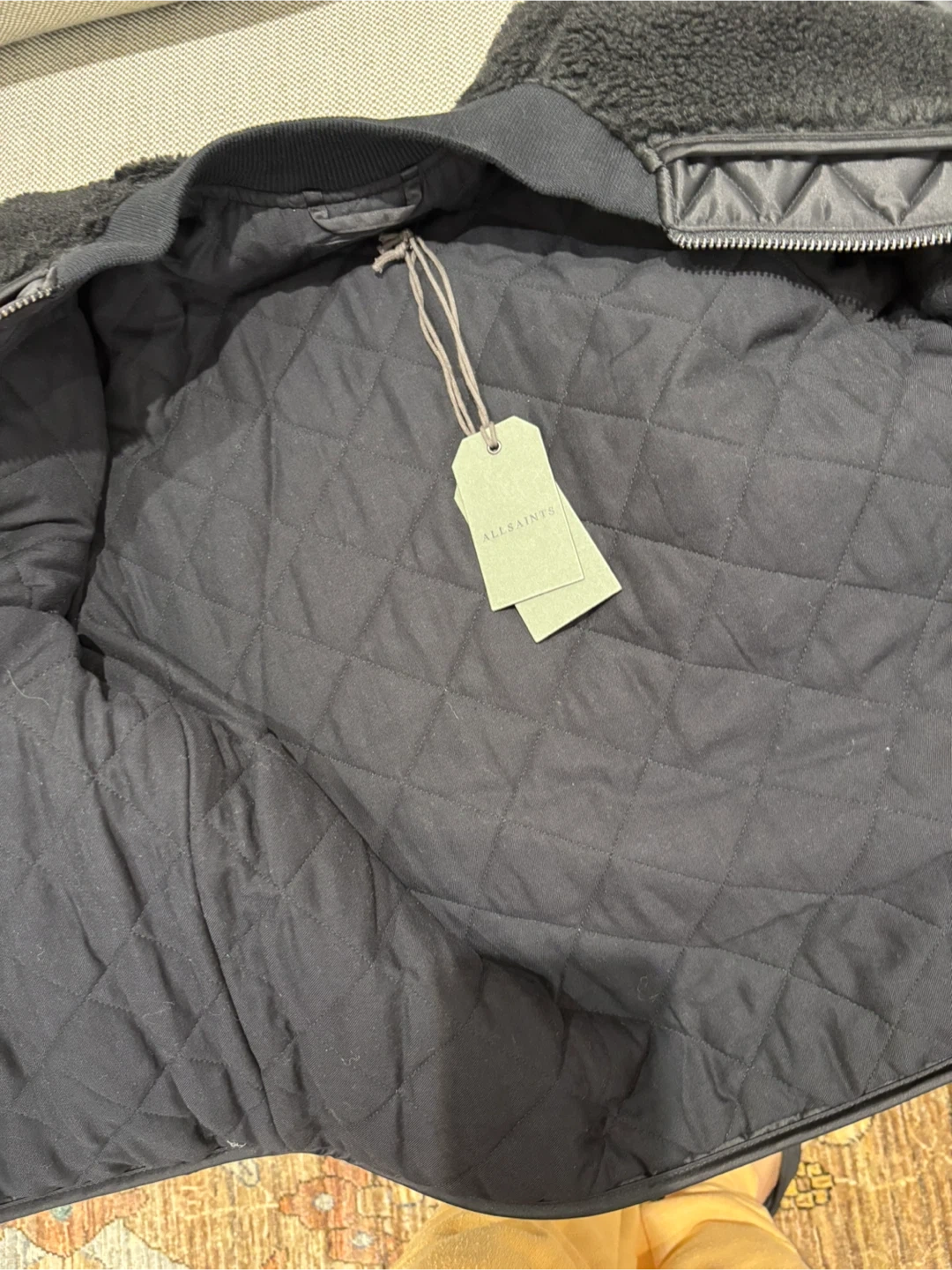 21All Saints Suri black bomber jacket in size US 0. The jacket is made of Econyl and sherpa like material, a unique design with a mix of textures and materials. Perfect for adding a stylish edge to your wardrobe!