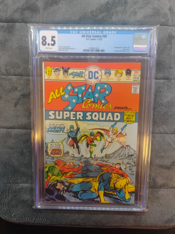 104Selling All-Star Comics #58, graded CGC 8.5. Features the Justice Society of America and the first appearance of Power Girl (Kara Zor-L). Published by DC Comics, dated February 1976.