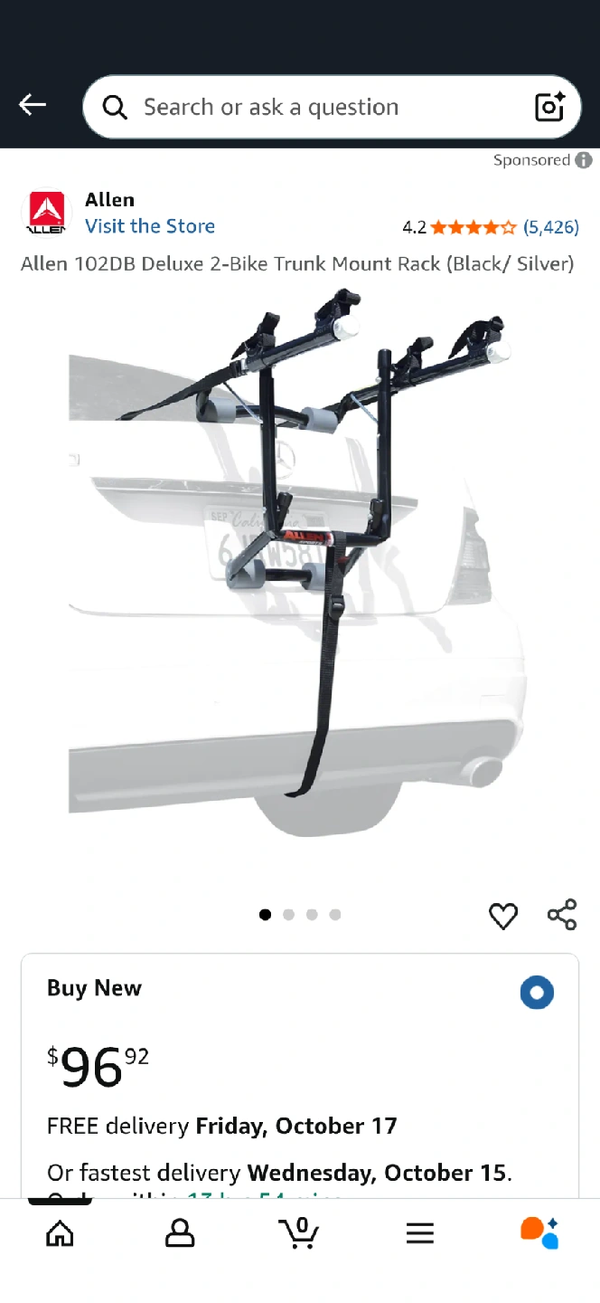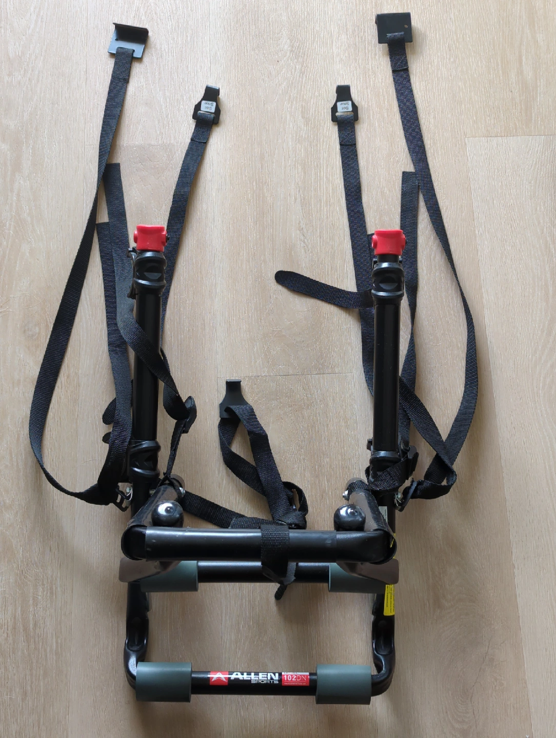 110$35 Allen Sports 102DB Deluxe 2-Bike Trunk Mount Rack It's in good shape and ready to help you transport your bikes safely. This rack is designed to securely hold two bikes and easily attaches to the trunk of your car. Was used on our Fiat 500 and now no longer required.