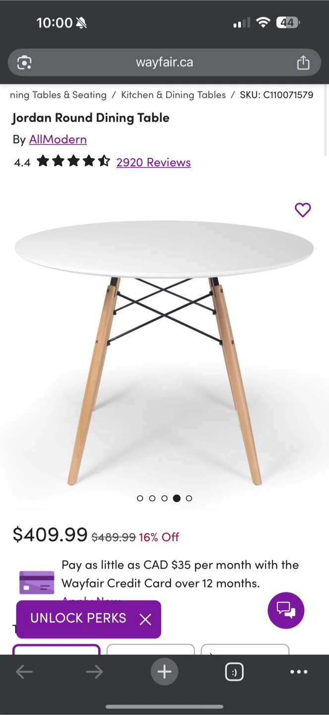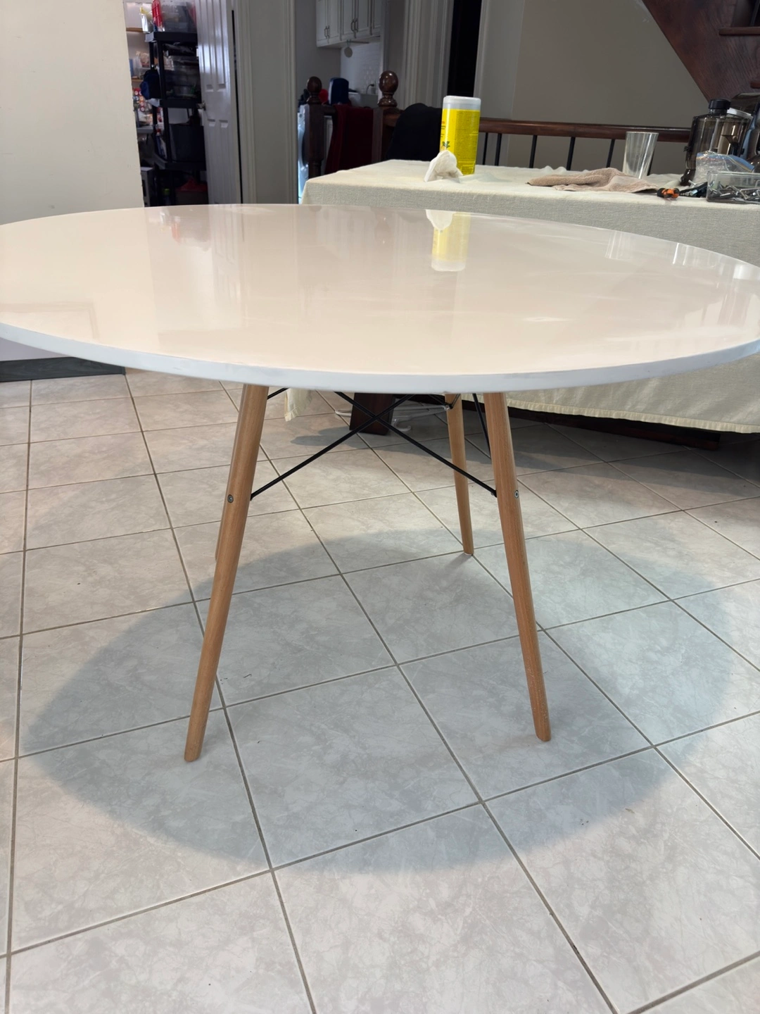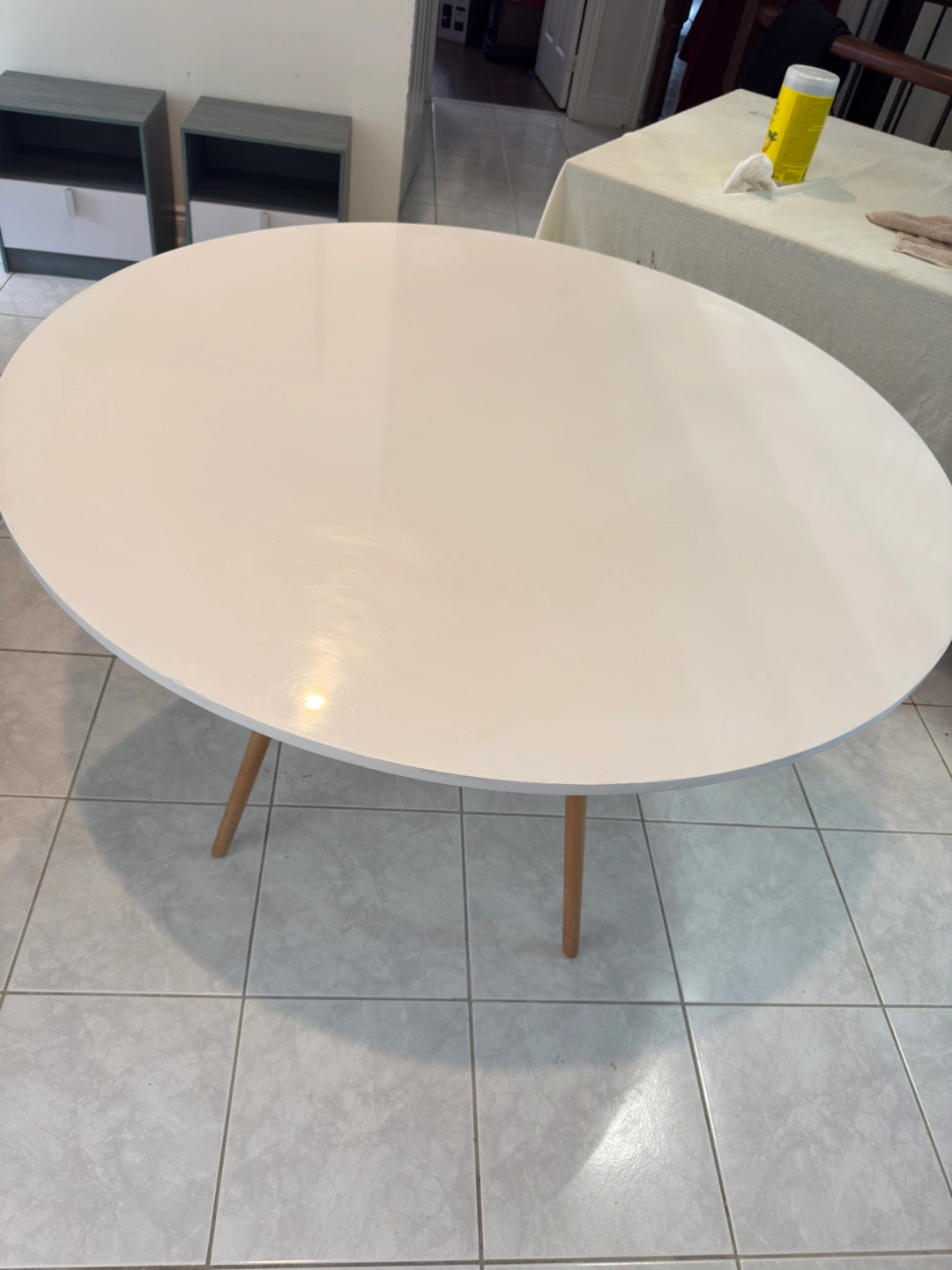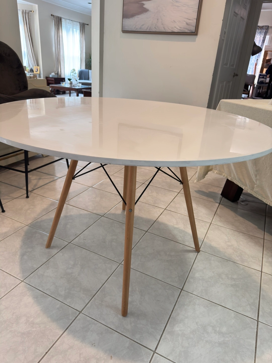 Selling a round dining table by AllModern. It's the Jordan model and features a sleek, minimalist design with a white tabletop and wooden legs. The table is in great shape and measures approximately 120cm in diameter. Originally bought for $409.99.