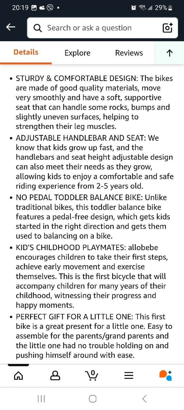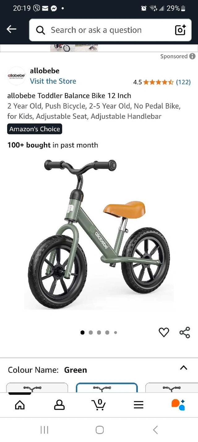 This Allobebe toddler balance bike is perfect for little ones aged 2-5 years, designed to help them learn balance and coordination before transitioning to a pedal bike. It features a sturdy frame and adjustable seat and handlebars. * **Brand:** Allobebe * **Type:** Balance Bike * **Age Range:** 2-5 years * **Colour:** Green While this balance bike has brought joy to my child, it is in used condition, and the seat has a tear on it. I'm asking $30, but I'm open to reasonable offers. If the ad's still up, the bike's still available.
