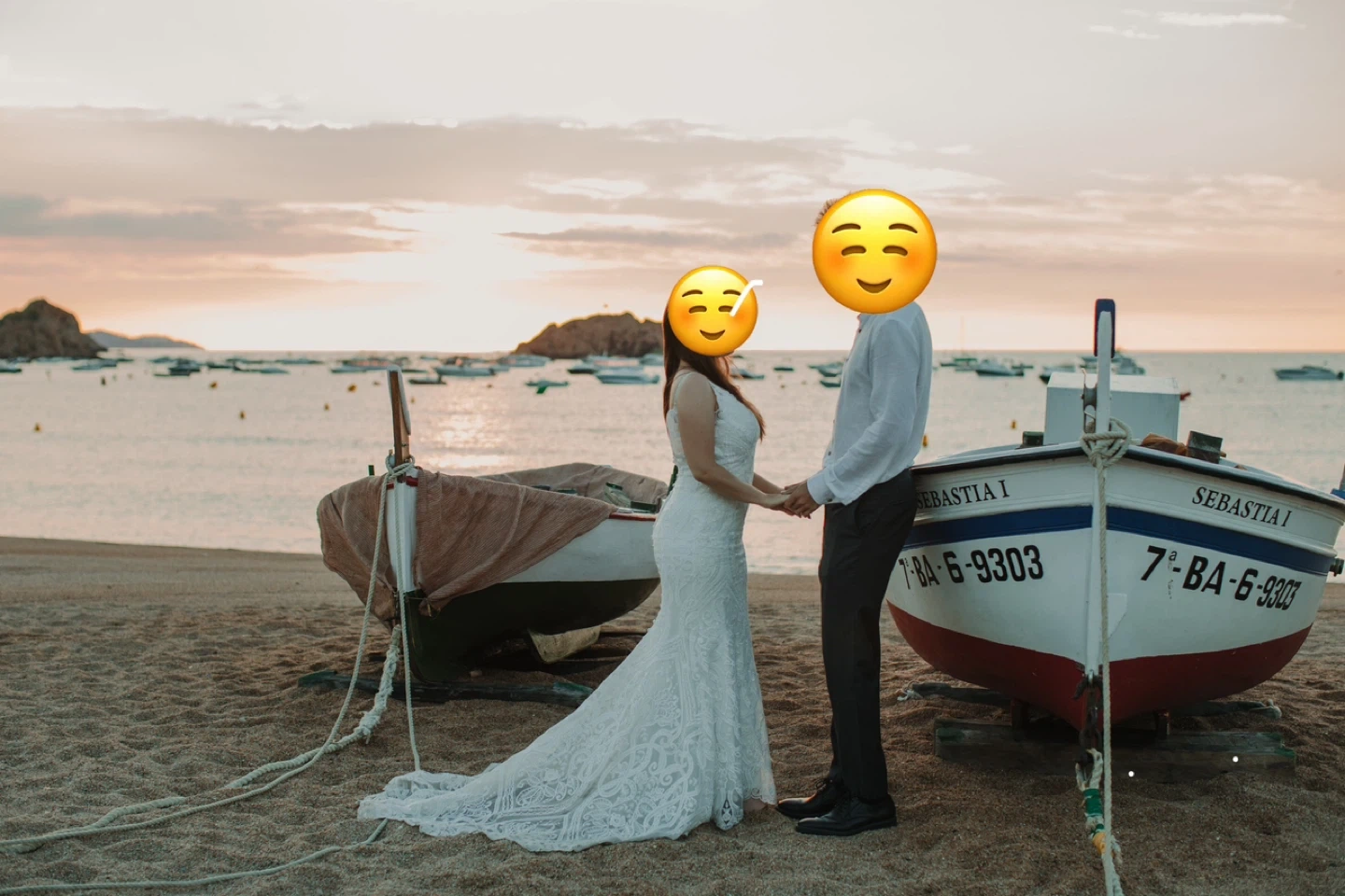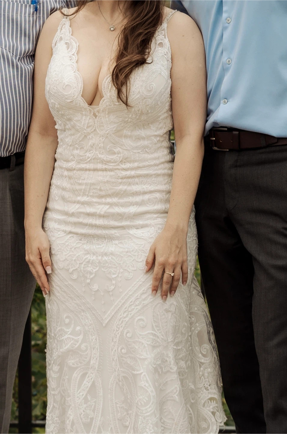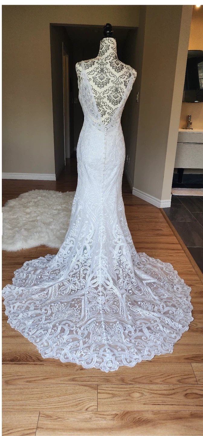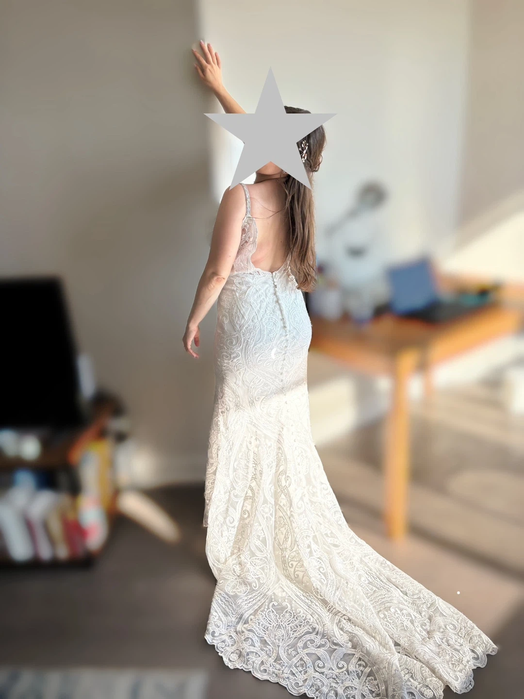 10💫 Allure Bridals – Style L453 | Ivory Fit & Flare Wedding Dress Size: Label US 8 (fits like US 6) Measurements: Height 161 cm (with shoes) | Bust 90 cm | Waist 68 cm | Hips 88 cm Condition: The dress was worn once for the wedding reception and two photo sessions outdoors. It has very light signs of wear consistent with gentle use, and remains in beautiful condition. Happy to provide pictures. It was professionally dry-cleaned. ✨ Description Elegant and comfortable ivory lace wedding dress from Allure Bridals (Style L453). This gown features a flattering fit-and-flare silhouette that beautifully accentuates the figure. The lace overlay is detailed with subtle shimmer, sequins, and crystal beadwork — enough sparkle to catch the light without being overpowering. The dress has a V-neckline, spaghetti straps, and a low back finished with button and gem closures partly hidden by a zipper. The dramatic lace train photographs beautifully yet can be easily bustled for the reception or dancing (three hooks hidden under the zipper area). Perfect for a traditional, garden, or destination wedding timeless, feminine, and easy to move in. Professionally altered for a graceful fit and hemmed to wear with flat shoes or low heels. 🌸 Details & Special Features • Fabric: Lace with sequins and embroidery • Color: Soft ivory (not bright white) • Hidden bustle hooks for reception • Diamond-like gems on shoulder straps and back • Professionally altered and dry cleaned • No flaws or visible wear ✂️ Alterations • Shortened hemline to fit 161 cm (with shoes) and shorten • Taken in slightly at the waist and hips for a slimmer fit, The shoulder straps were professionally shortened by approximately 1 cm for a better fit. 💍 Notes Originally purchased for CA $2,000, asking CA $500 (75% off retail). Located in Canada — available for local pickup or shipping.