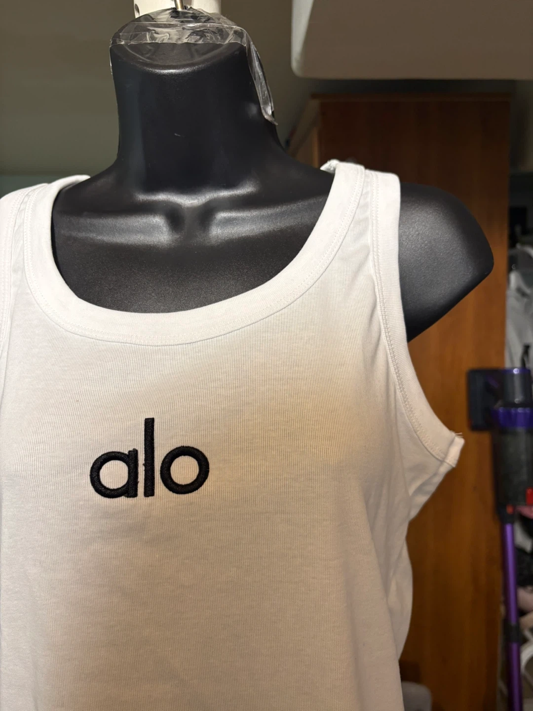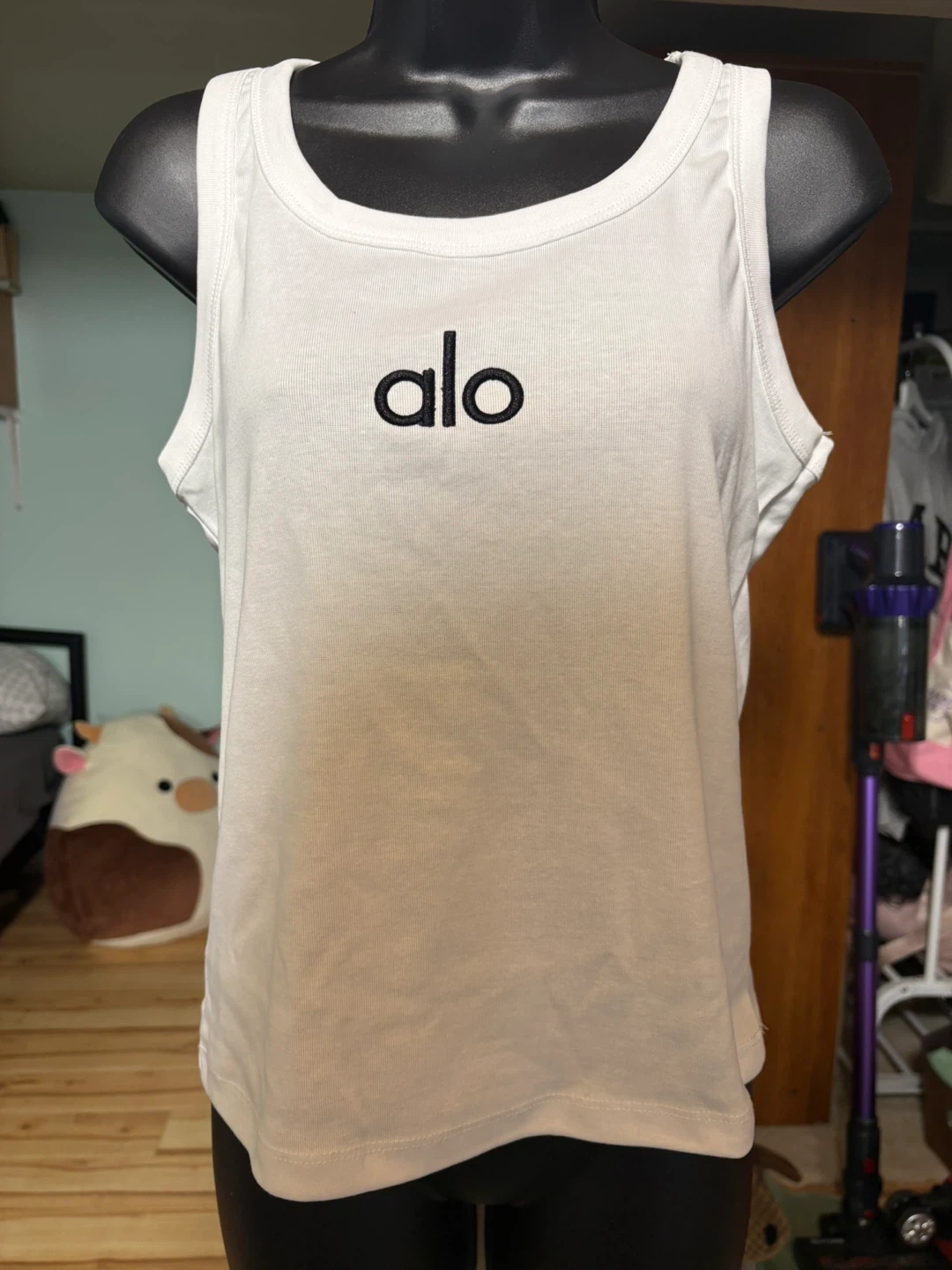Selling an Alo Yoga white tank top! It's in great condition and perfect for workouts or casual wear. The material is super comfortable and breathable, making it ideal for any activity