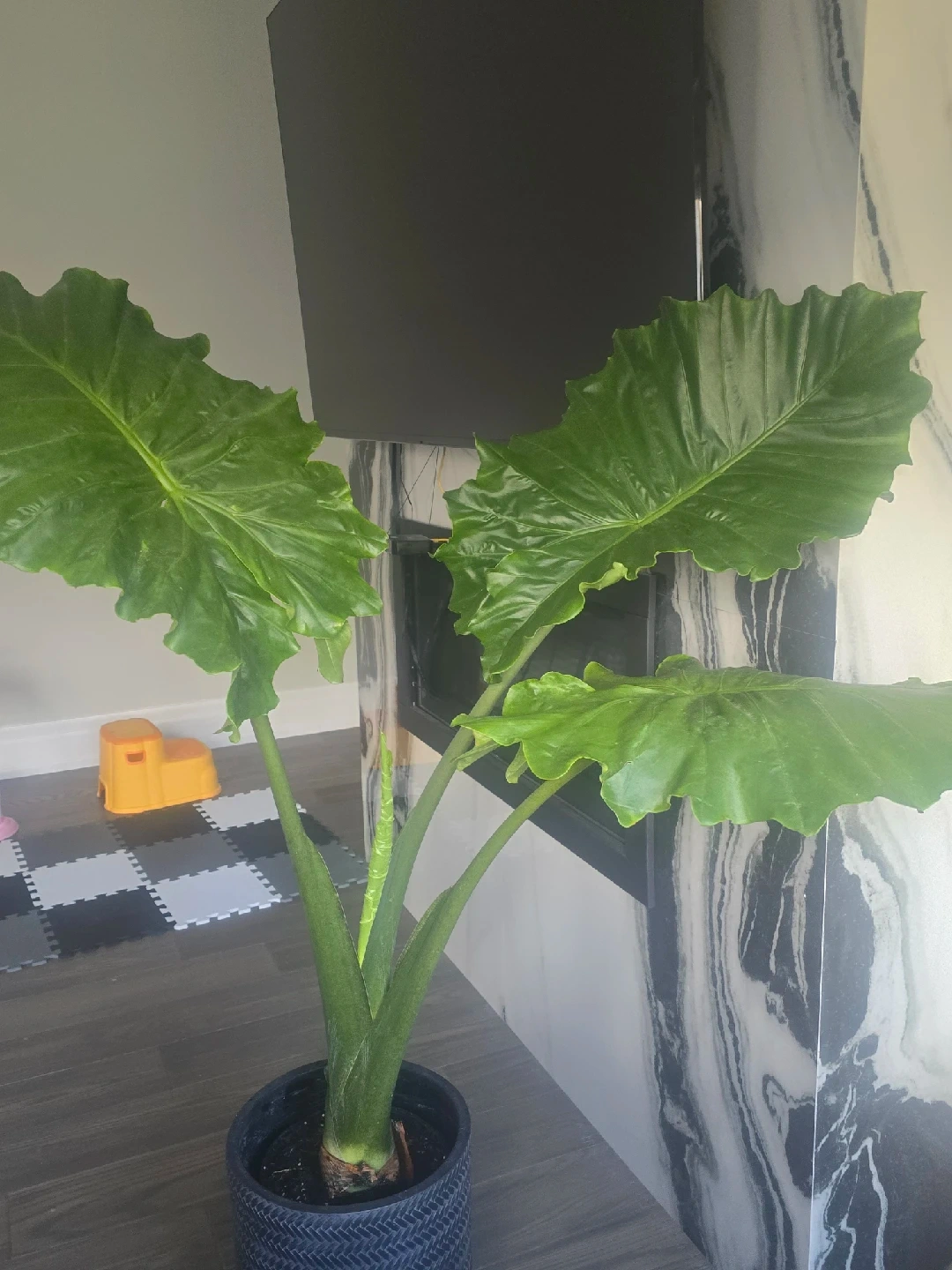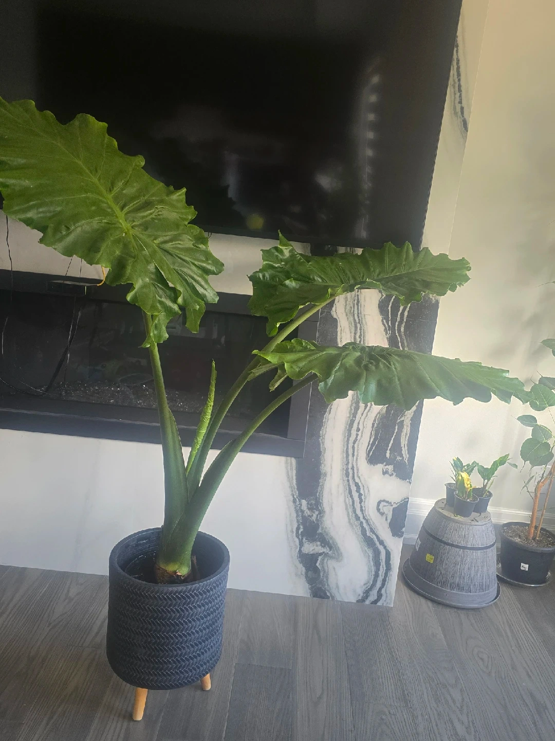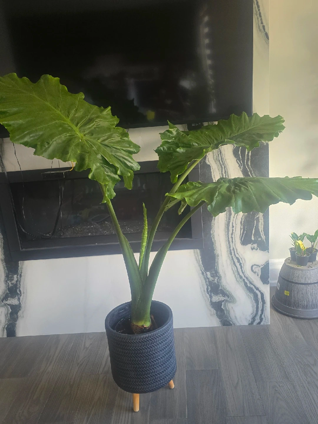 257Selling a healthy Alocasia Elephant Ear plant! This plant has striking, large green leaves that will add a tropical vibe to your home. It comes in a stylish blue pot with wooden legs, ready to be displayed