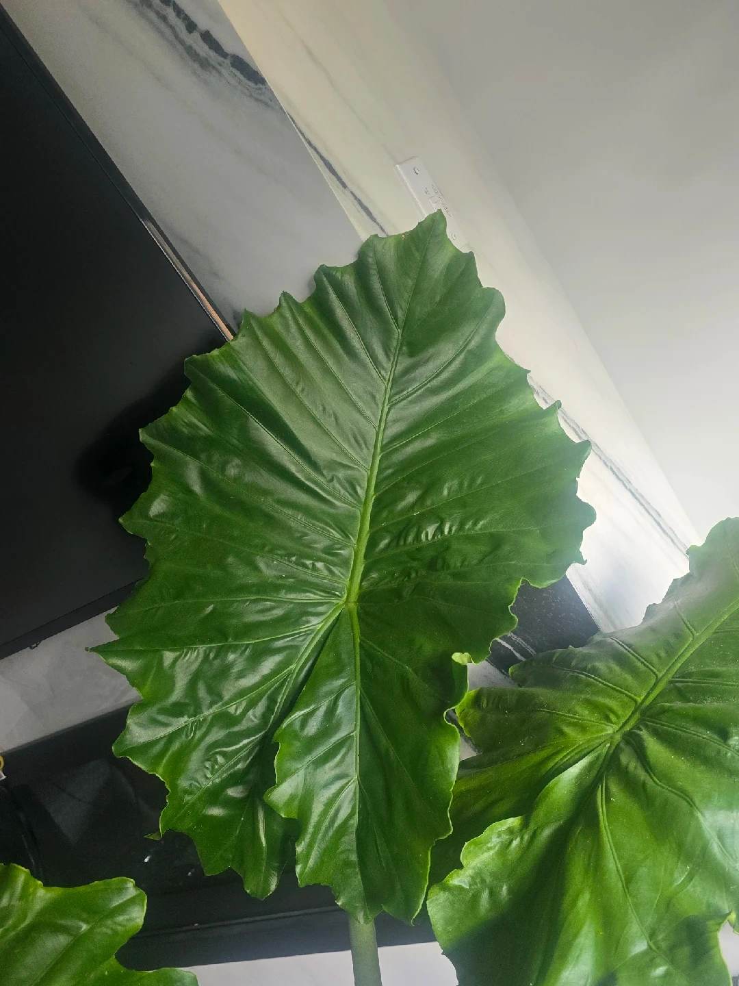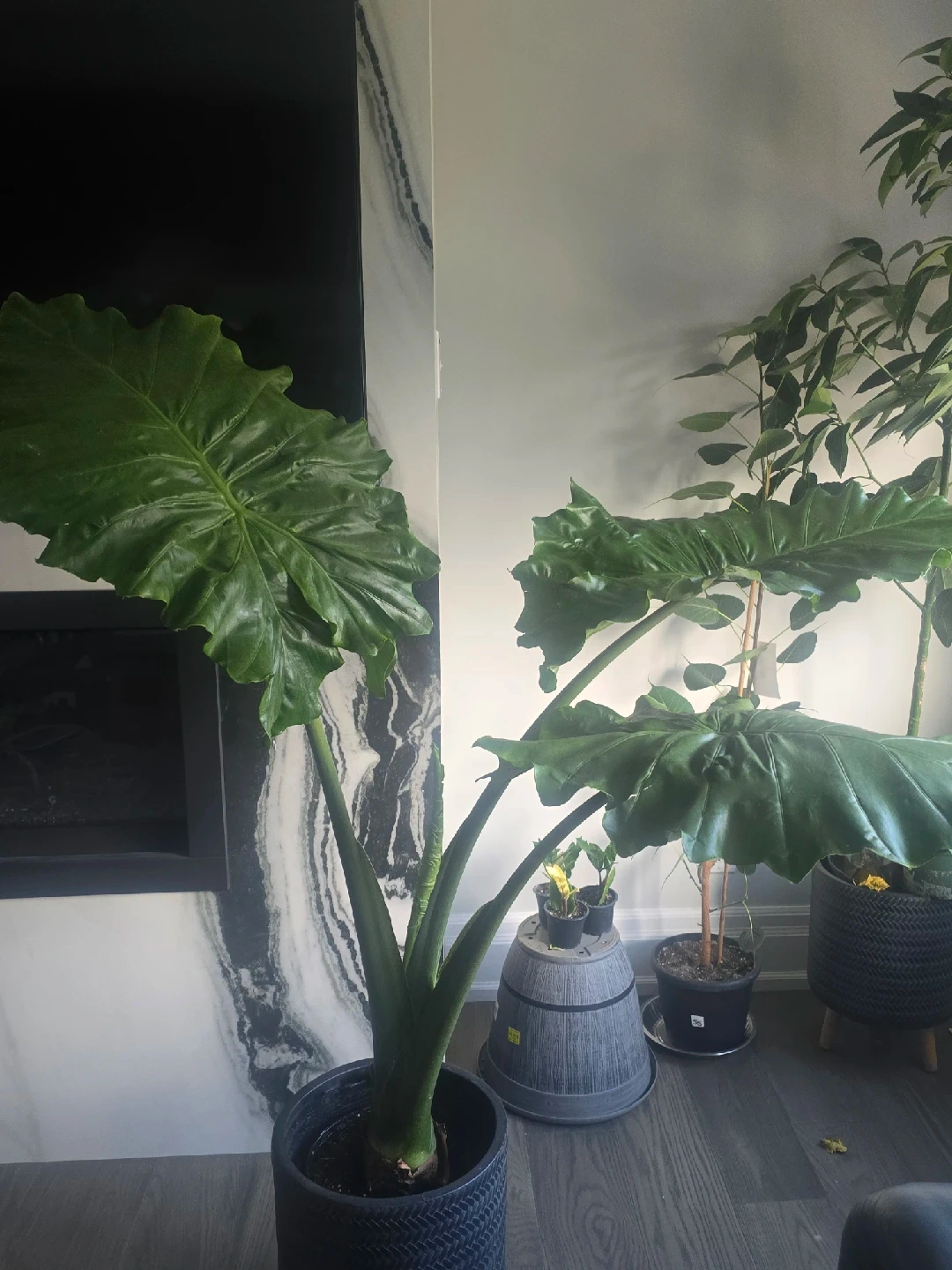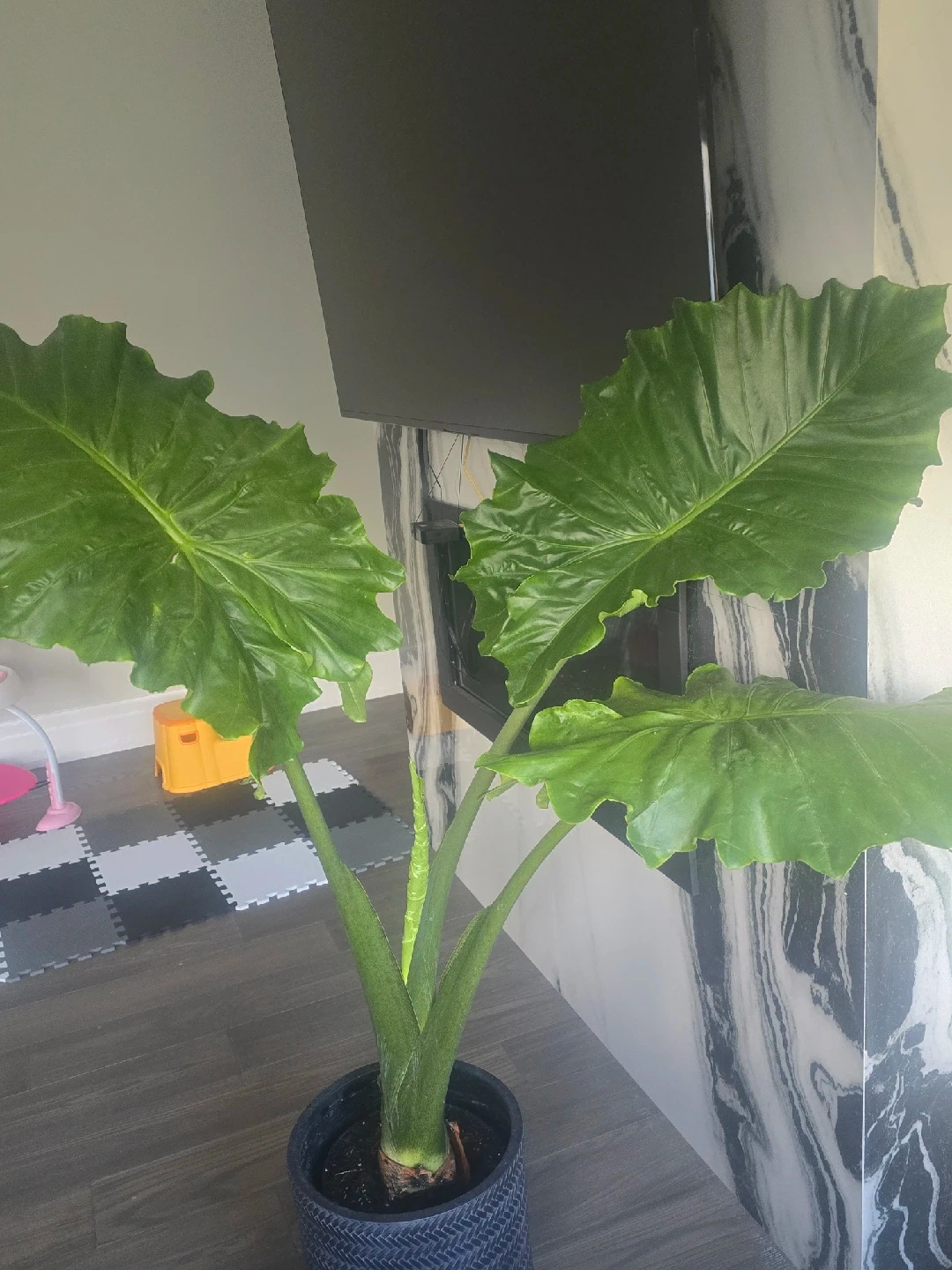 257Selling a healthy Alocasia Elephant Ear plant! This plant has striking, large green leaves that will add a tropical vibe to your home. It comes in a stylish blue pot with wooden legs, ready to be displayed