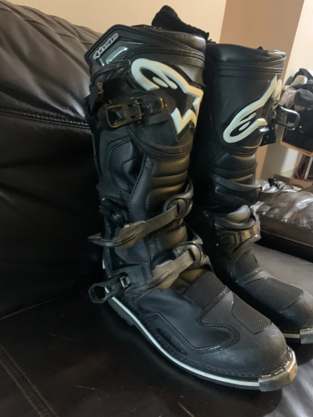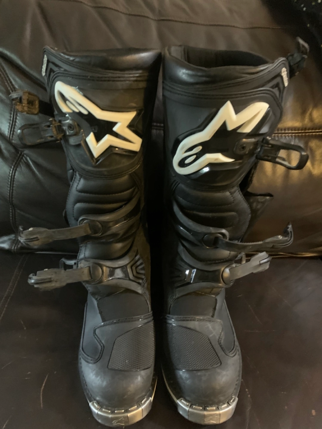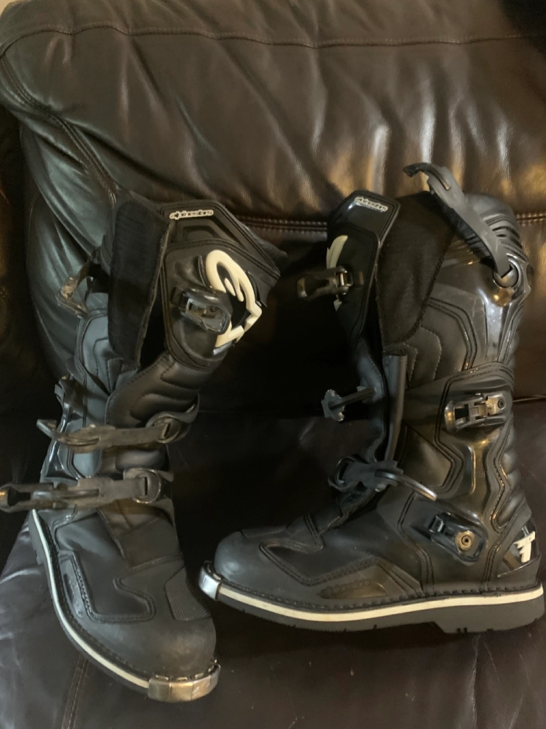 Selling a pair of Alpinestars Tech 7 motocross boots in black. They show signs of use, but are still in good condition for hitting the trails!