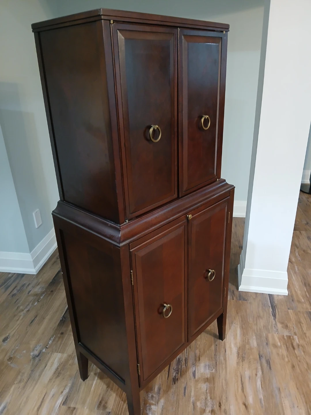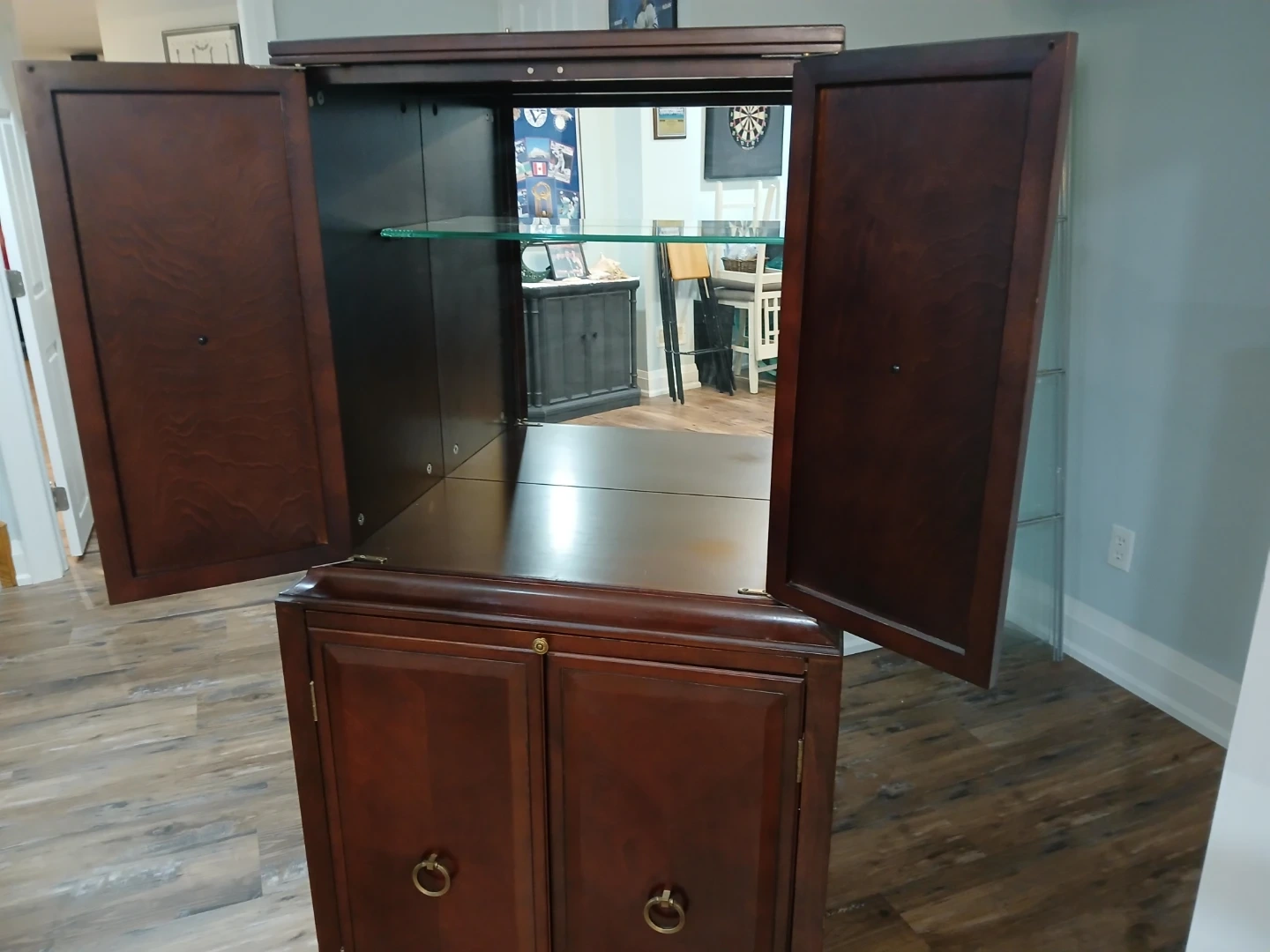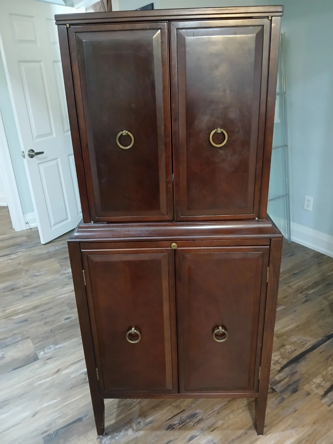 A stylish dark wood bar cabinet featuring glass shelves and a mirrored back. It has a pull-out serving tray and lower cabinet storage with ring pulls. This piece is perfect for storing barware or as a display cabinet.This is a Bombay Company piece