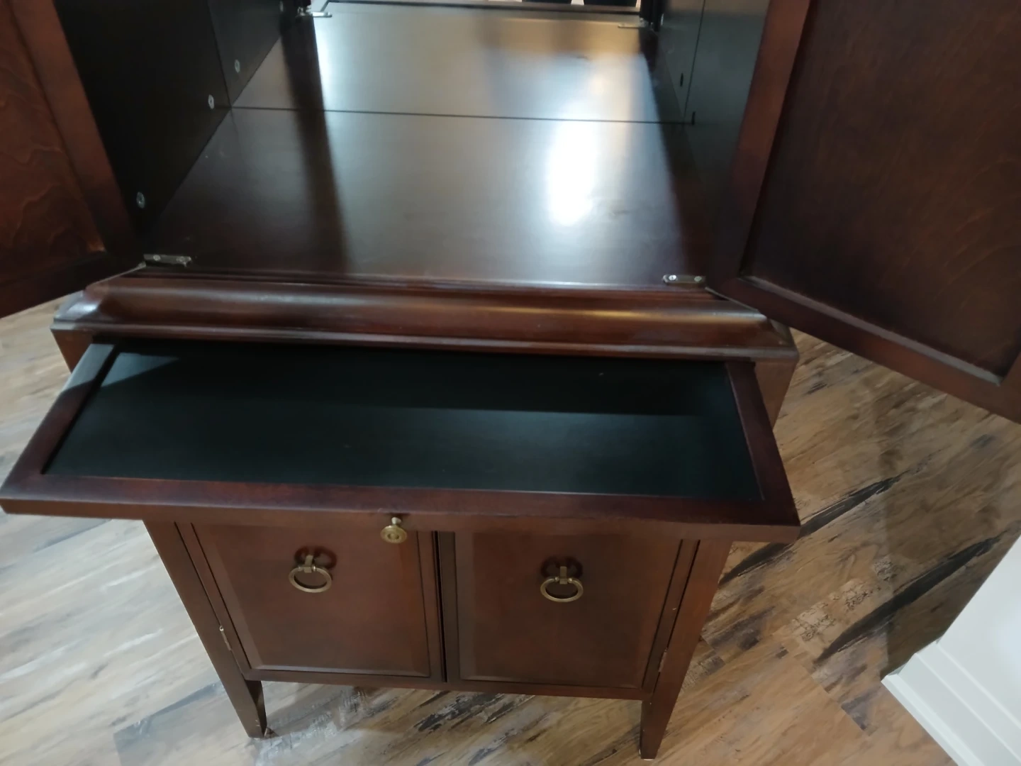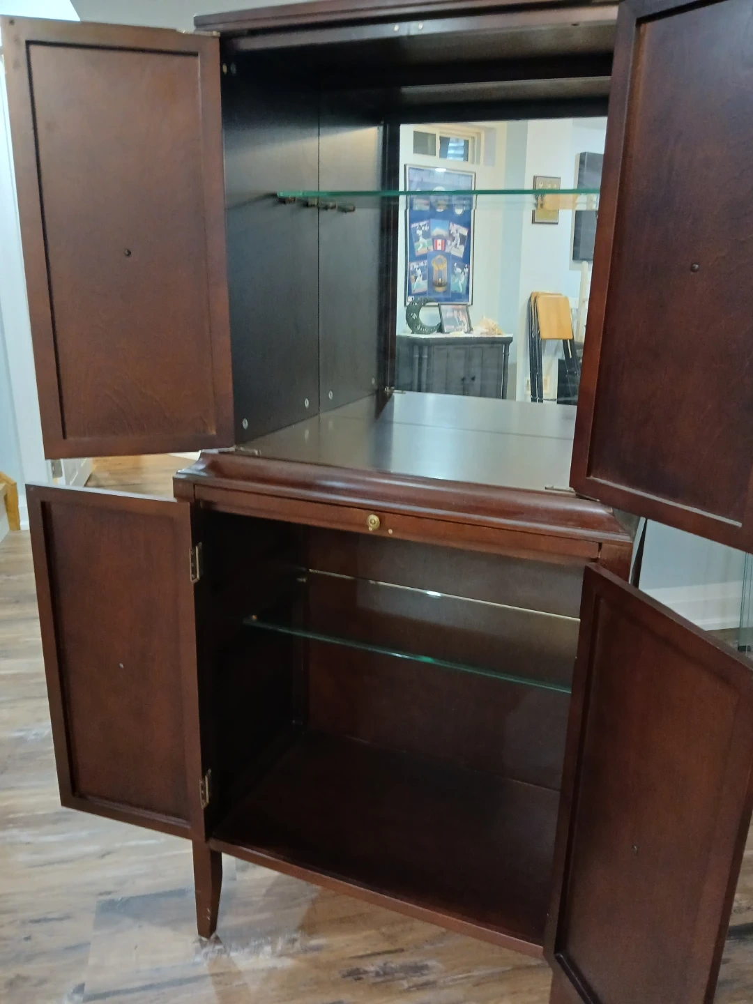 A stylish dark wood bar cabinet featuring glass shelves and a mirrored back. It has a pull-out serving tray and lower cabinet storage with ring pulls. This piece is perfect for storing barware or as a display cabinet.This is a Bombay Company piece