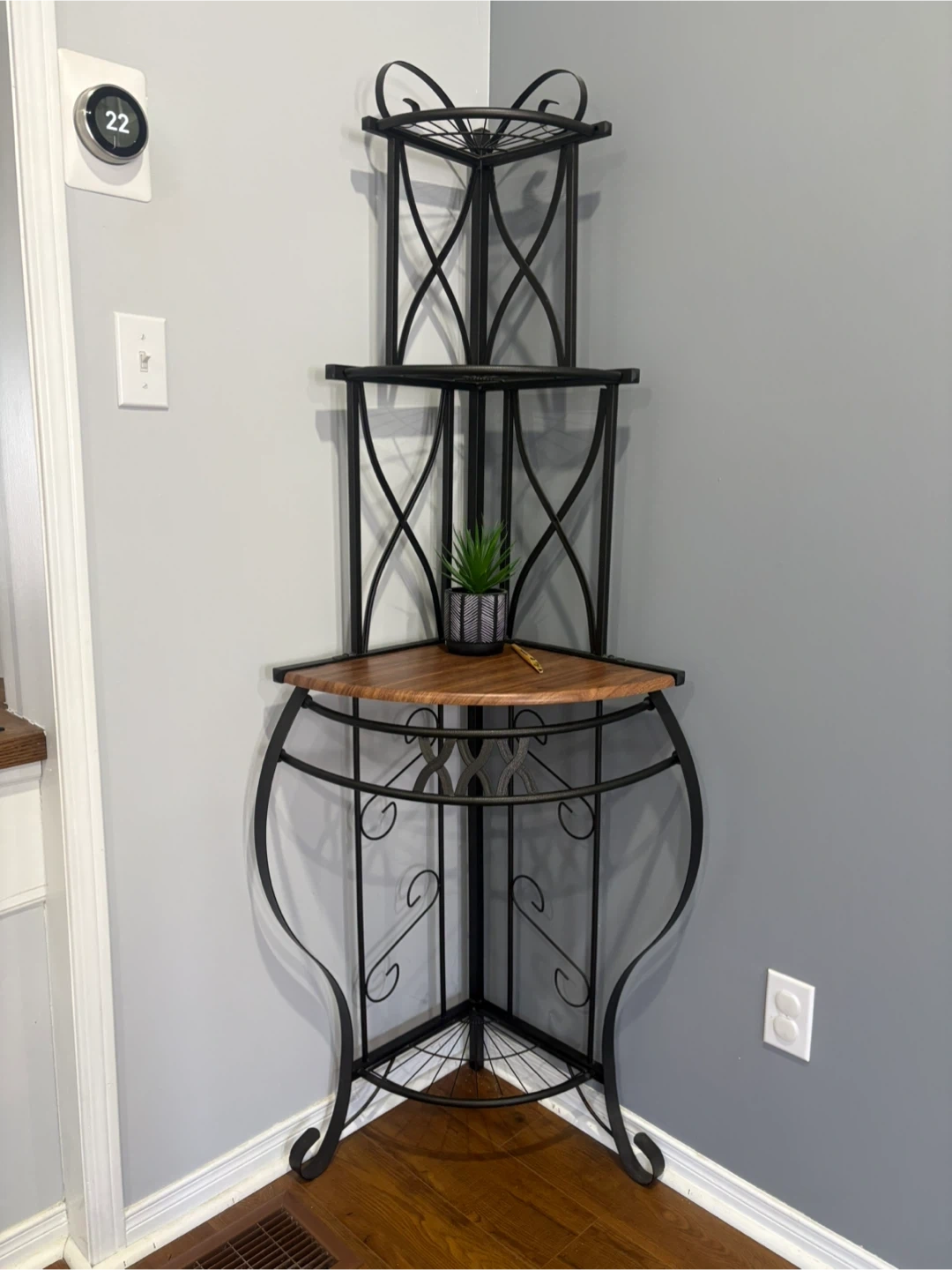 This is a three-tiered corner shelf unit with black metal framing. It has a wood-look top shelf and decorative scrollwork. Its tiered design makes it great for displaying plants or decorative items.