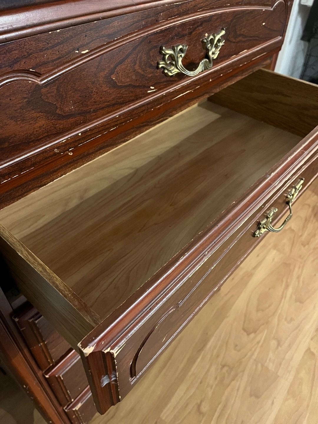 A vintage wooden chest dresser with five drawers. It's finished in a dark wood tone with ornate brass-style drawer pulls. Shows some wear consistent with its age, particularly on the top surface and drawer edges. Solid wood. It can look new if you paint on it.