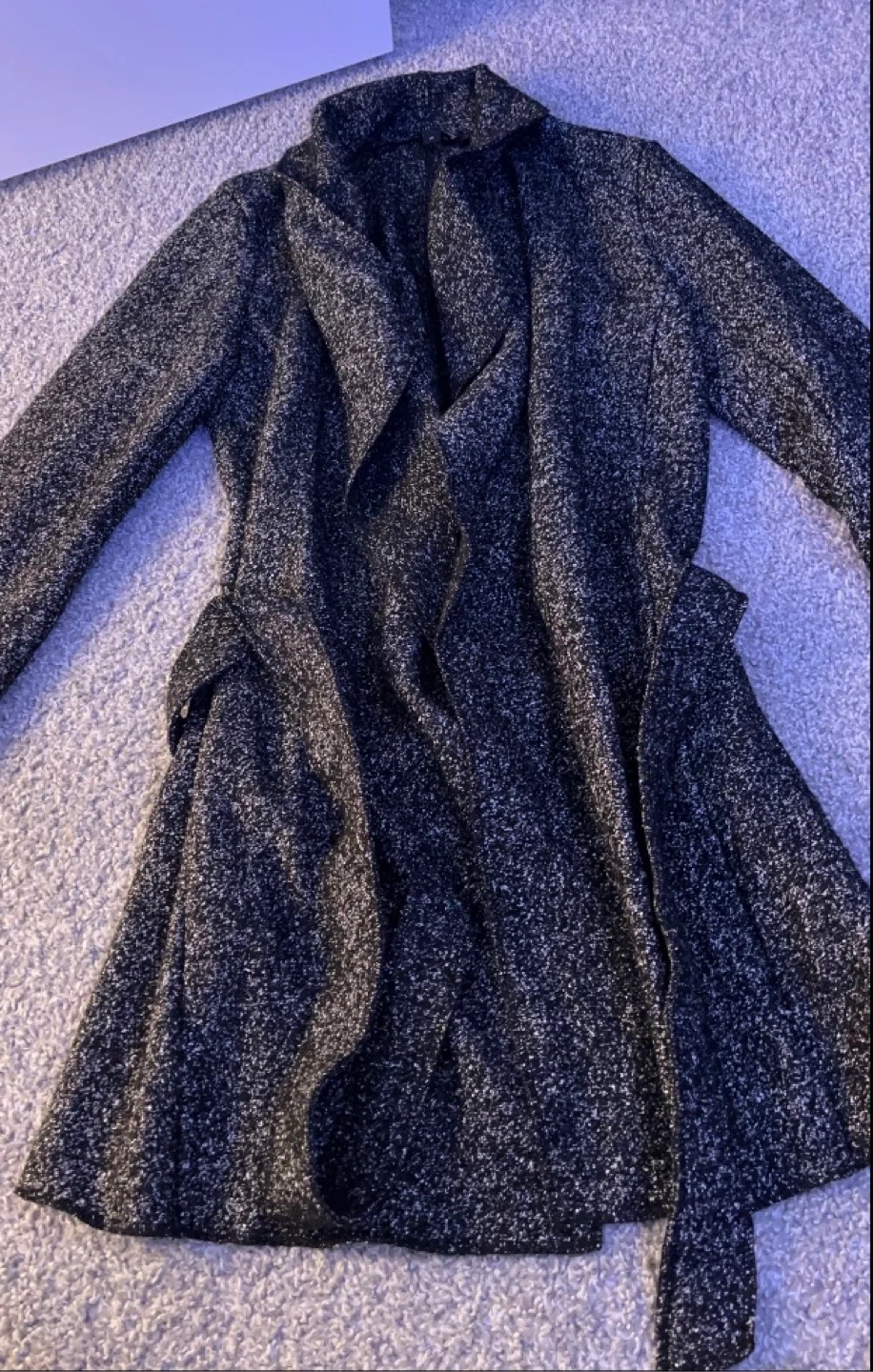 This is a women's belted coat with a speckled grey pattern. It features a stylish draped collar and comes with a matching belt. It's made from a cozy material, perfect for cooler weather.