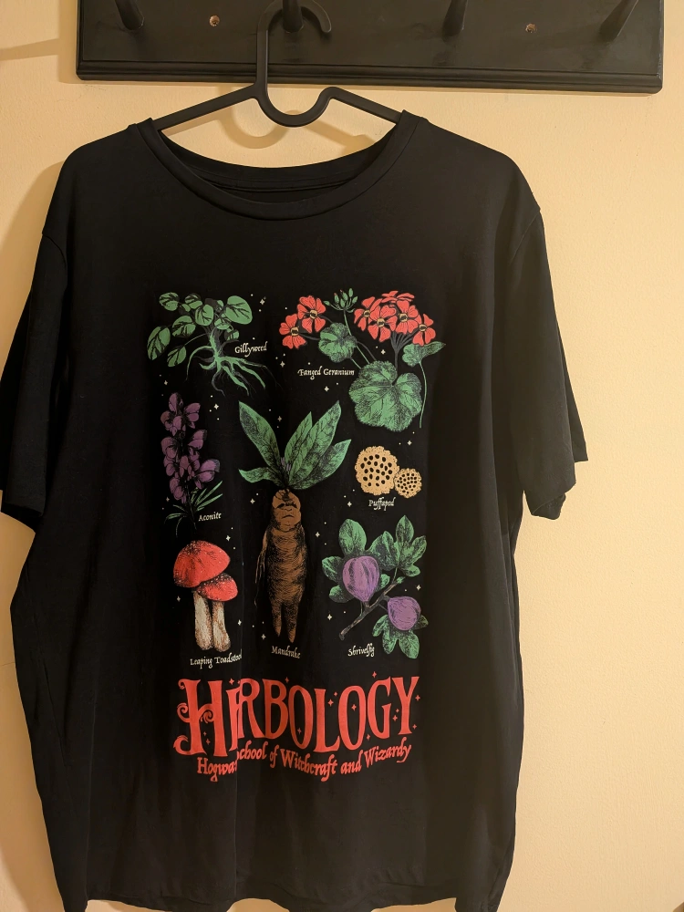 Selling a Harry Potter Herbology t-shirt in size M. It's black and made of 60% cotton and 40% polyester. The design features various magical plants from the Herbology class at Hogwarts School of Witchcraft and Wizardry. Barely worn