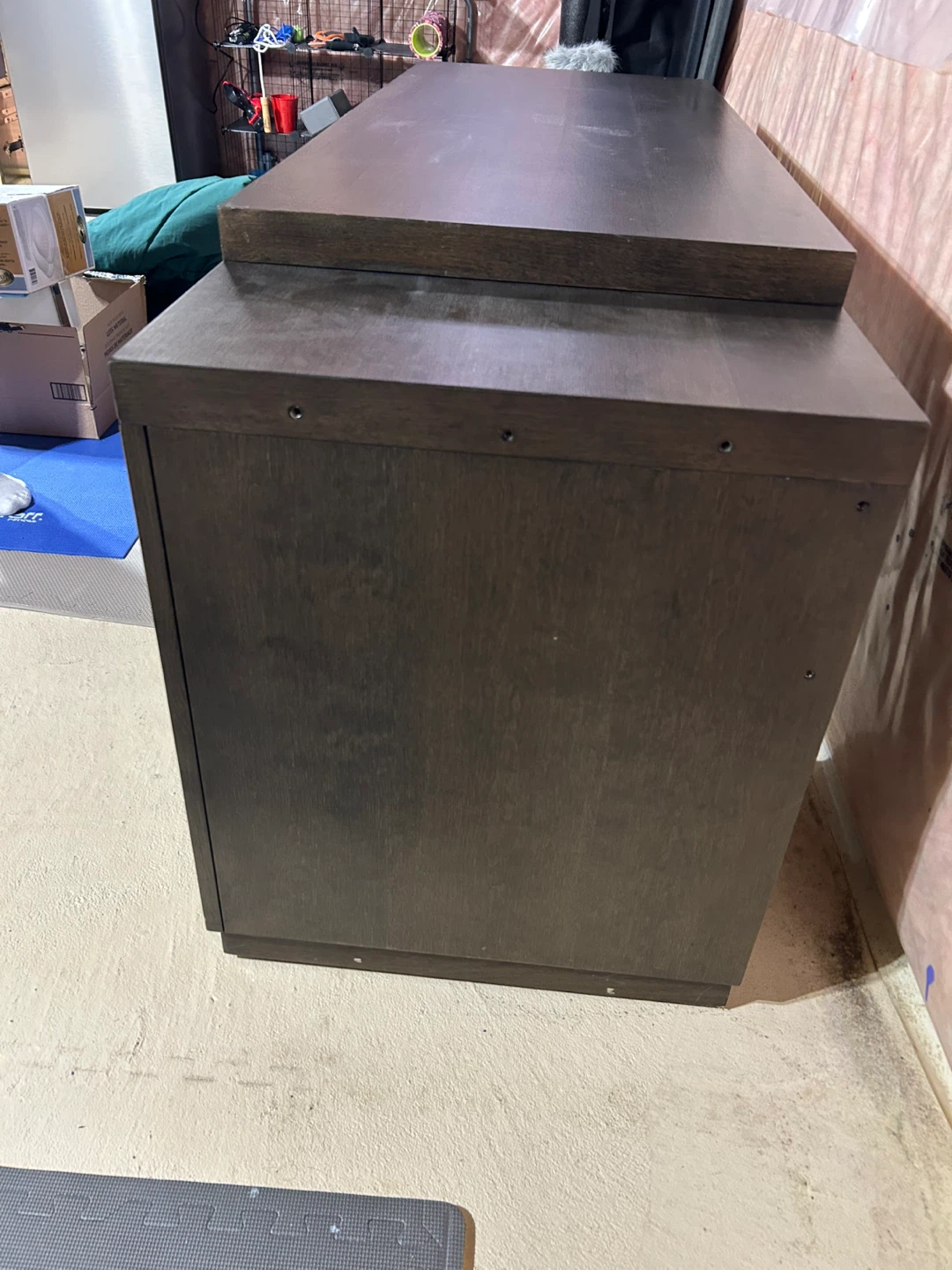 This desk features a dark wood finish and three drawers for storage. Its dimensions are approximately 65 inches wide, 23 inches deep, and 30 inches high. It's a sturdy piece for any home office or workspace. Missing screws this is why priced so well but they can be purchased from hardware store. Already disassembled ready to move.