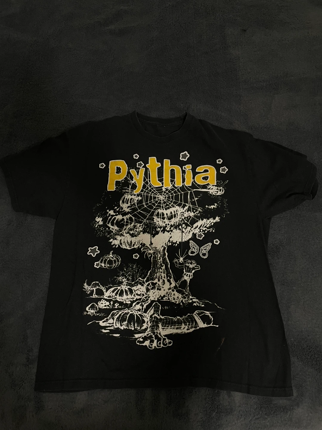 Black Pythia Glow Garden graphic t-shirt. Features a tree design with pumpkins and butterflies. Cotton material. Glows in the dark.