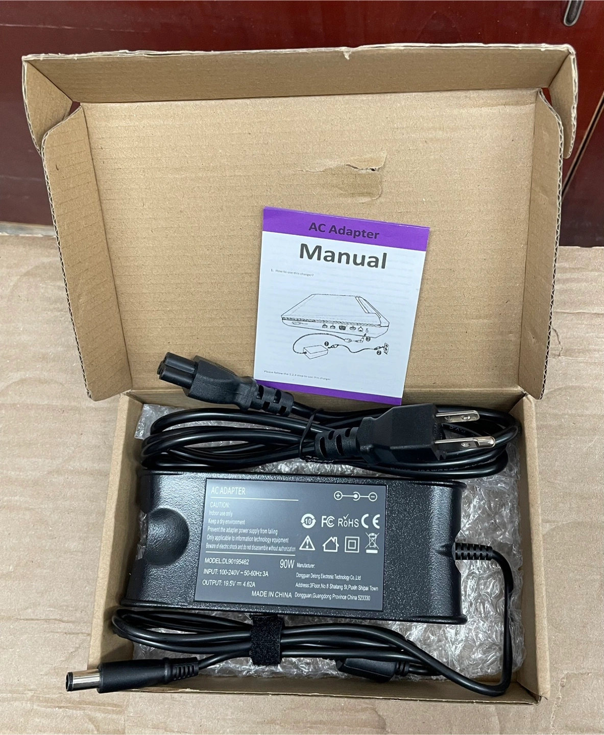 This is a 90W AC adapter. It has an output of 19.5V 4.6A. Includes the manual.
