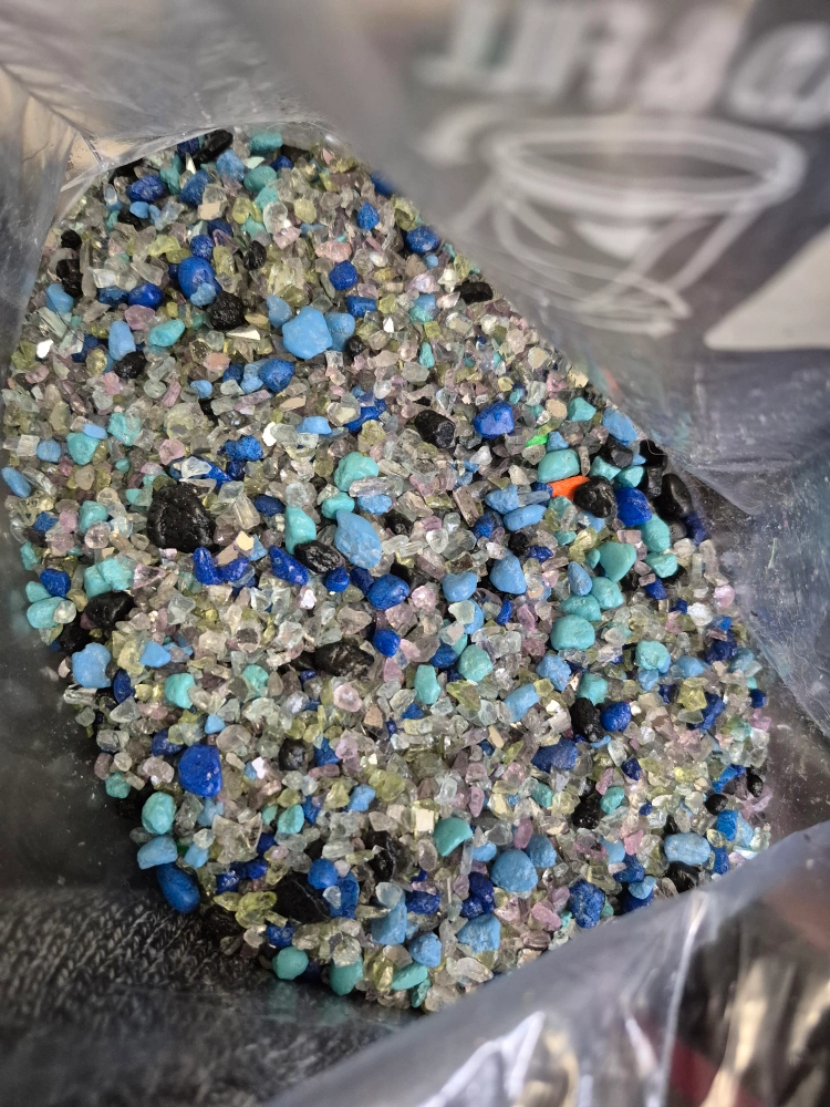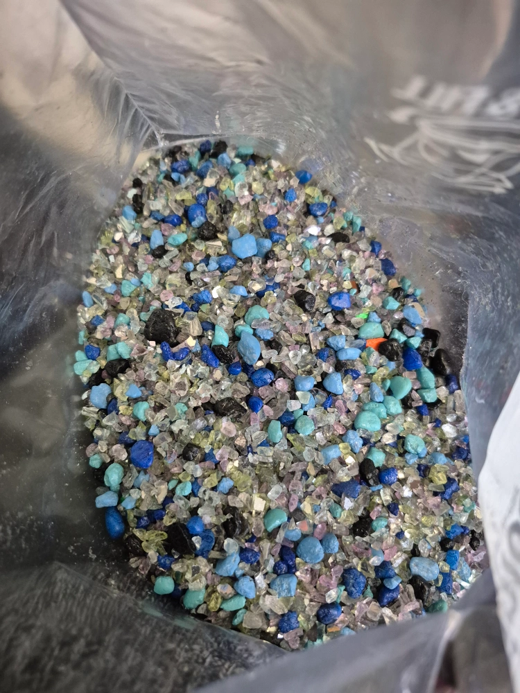 Crushed glass in various colours. Mixed hues of blue, green, and purple. Great for arts and crafts, offering a visually appealing medium to work with.