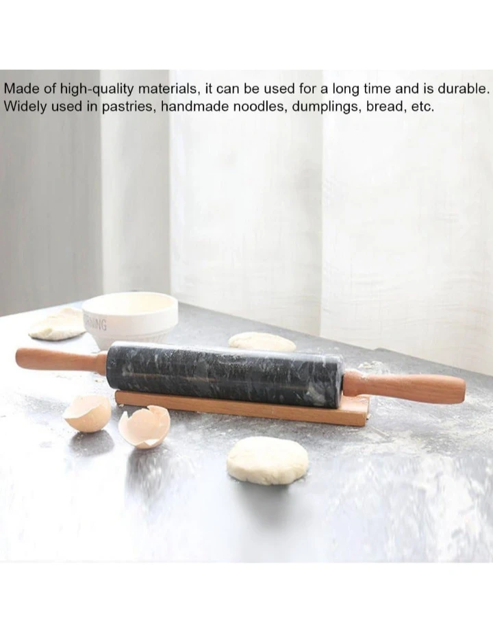 This rolling pin is made of marble with comfortable wooden handles. It's widely used for pastries, noodles, and bread. It comes with a wooden stand for storage.