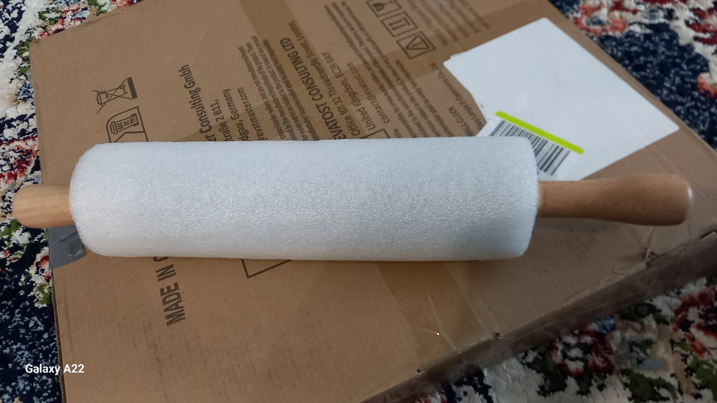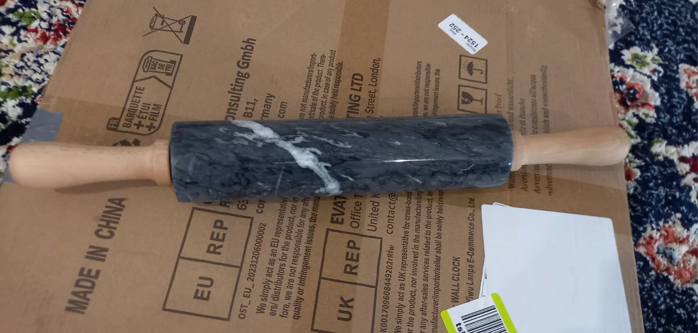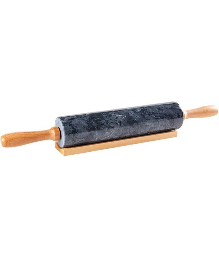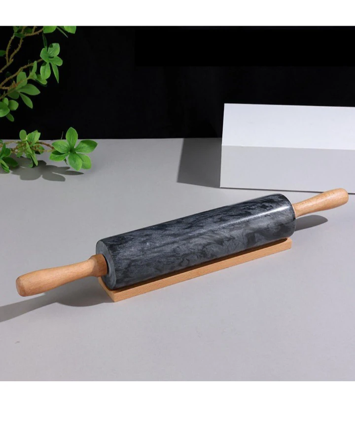 This rolling pin is made of marble with comfortable wooden handles. It's widely used for pastries, noodles, and bread. It comes with a wooden stand for storage.
