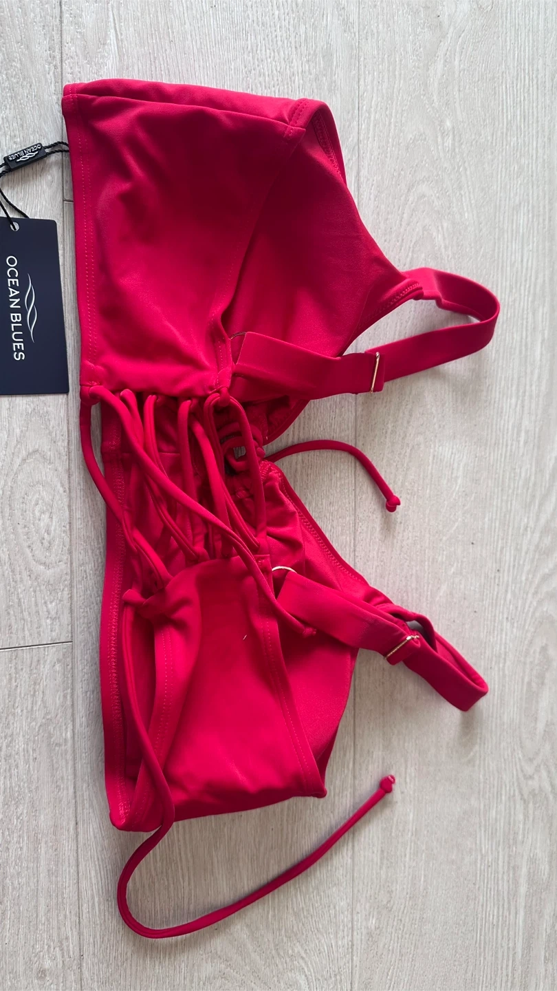 This is an OCEANBLUES red bikini top. It features adjustable straps and a tie front detail. Made with a stretchy fabric blend.